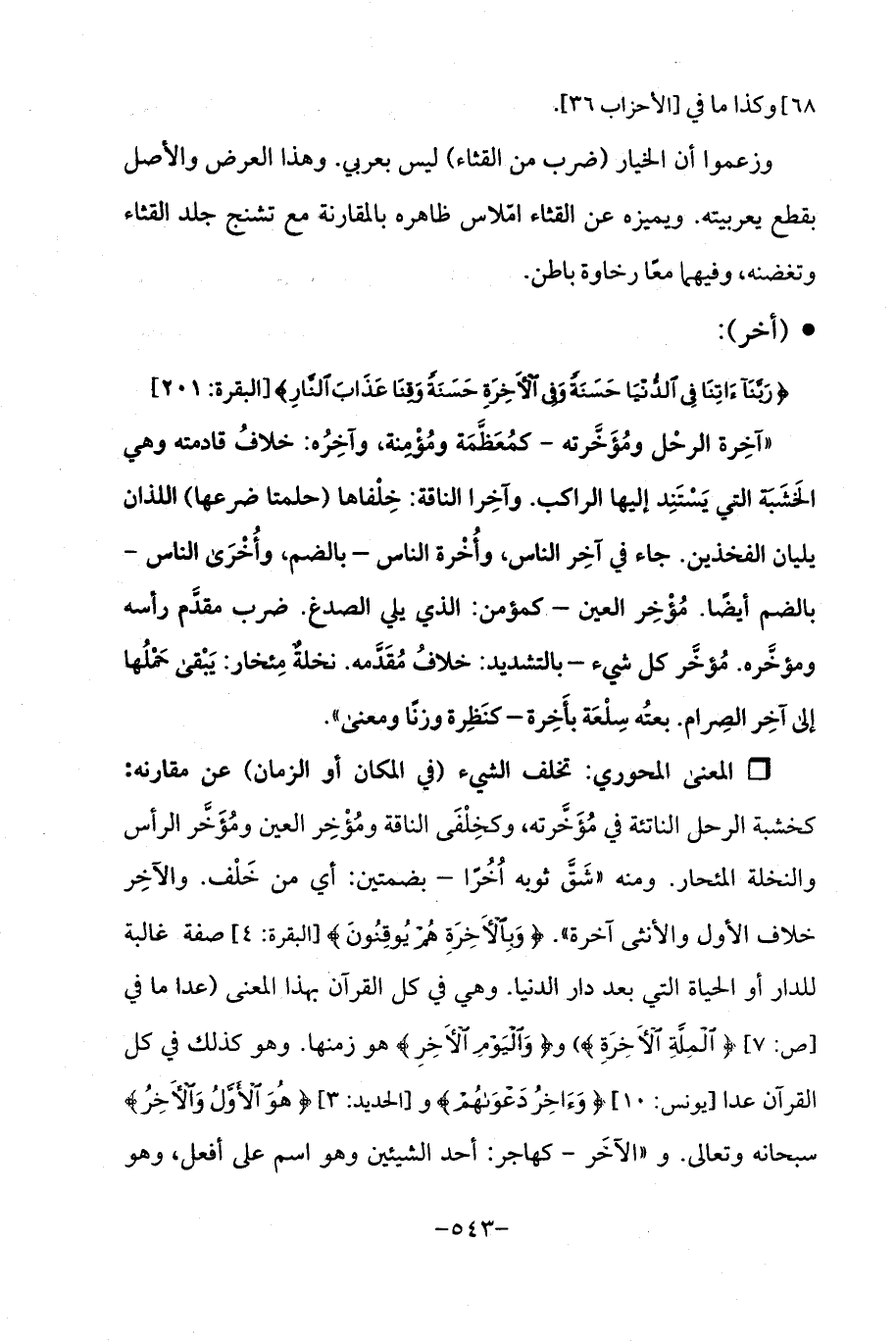 Qتخلف الشيء (في المكان أو الزمان) عن مقارنه: كخشبة الرحل الناتئة في مُؤَخَّرته، وكخِلْفَى الناقة ومُؤخِر العين ومُؤَخَّر الرأس والنخلة المئحار. ومنه "شَقَّ ثوبه اُخُرًا -بضمتين: أي من خَلْف. والآخِر خلاف الأول والأنثى آخرة ". {وَبِالْآخِرَةِ هُمْ يُوقِنُونَ} [البقرة: 4] صفة غالبة للدار أو الحياة التي بعد دار الدنيا. وهي في كل القرآن بهذا المعنى (عدا ما في [ص: 7] {الْمِلَّةِ الْآخِرَةِ} و {وَالْيَوْمِ الْآخِرِ} هو زمنها. وهو كذلك في كل القرآن عدا [يونس: 10] {وَآخِرُ دَعْوَاهُمْ} و [الحديد: 3] {هُوَ الْأَوَّلُ وَالْآخِرُ} سبحانه وتعالى. و "الآخَر -كهاجر: أحد الشيئين وهو اسم على أفعل، وهو