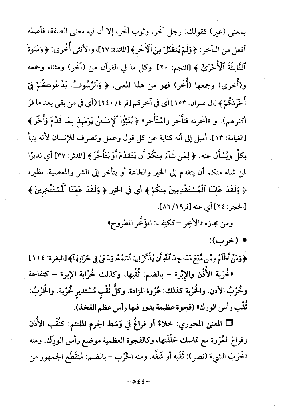 بمعنى (غير) كقولك: رجل آخَر، وثوب آخَر، إلا أن فيه معنى الصفة، فأصله أفعل من التأخر: {وَلَمْ يُتَقَبَّلْ مِنَ الْآخَرِ} [المائدة: 27]، والأنثى أُخْرى: {وَمَنَاةَ الثَّالِثَةَ الْأُخْرَى} [النجم: 20]. وكل ما في القرآن من (آخَر) ومثناه وجمعه و (أُخرى) وجمعها (أُخَر) فهو من هذا المعنى. {وَالرَّسُولُ يَدْعُوكُمْ فِي أُخْرَاكُمْ} [آل عمران: 153] أي في آخركم [قر 4/ 240] (أي في من بقى بعد ما فرّ أكثرهم). و "أخّرته فتأَخّر واسْتَأخر " {يُنَبَّأُ الْإِنْسَانُ يَوْمَئِذٍ بِمَا قَدَّمَ وَأَخَّرَ} [القيامة: 13]. أميل إلى أنه كناية عن كل قول وعمل وتصرف للإنسان لأنه ينبأ بكلٍّ ويُسْأَل عنه. {لِمَنْ شَاءَ مِنْكُمْ أَنْ يَتَقَدَّمَ أَوْ يَتَأَخَّرَ} [المدثر: 37] أي نذيرًا لمن شاء منكم أن يتقدم إلى الخير والطاعة أو يتأخر إلى الشر والمعصية. نظيره {وَلَقَدْ عَلِمْنَا الْمُسْتَقْدِمِينَ مِنْكُمْ} أي في الخير {وَلَقَدْ عَلِمْنَا الْمُسْتَأْخِرِينَ} [الحجر: 24] أي عنه [قر 19/ 86].