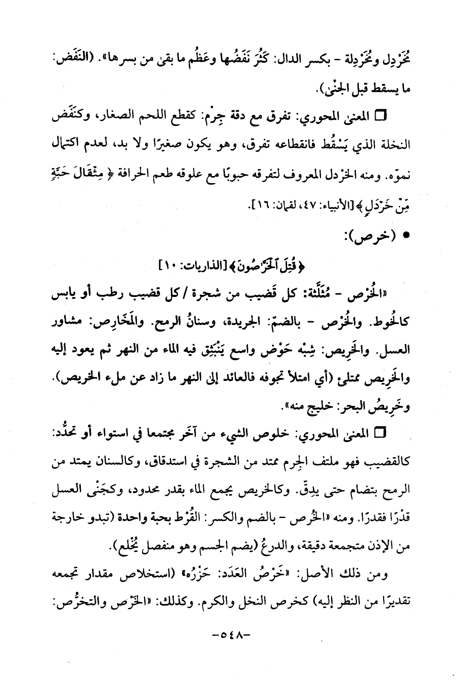 Qخلوص الشيء من آخَر مجتمعا في استواء أو تحدُّد: كالقضيب فهو ملتف الجِرم ممتد من الشجرة في استدقاق، وكالسنان يمتد من الرمح بتضام حتى يدِقّ. وكالخريص يجمع الماء بقدر محدود، وكجَنْى العسل قدْرَا فقدرًا. ومنه "الخُرص -بالضم والكسر: القُرْط بحبة واحدة (تبدو خارجة من الإذن متجمعة دقيقة، والدرعُ (يضم الجسم وهو منفصل يُخْلع).