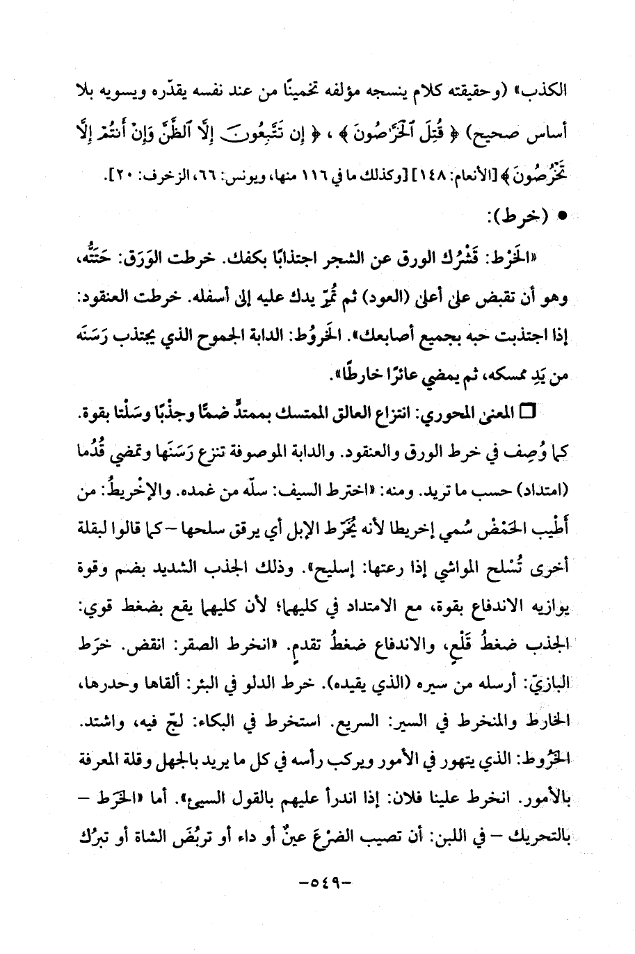 الكذب " (وحقيقته كلام ينسجه مؤلفه تخمينًا من عند نفسه يقدّره ويسويه بلا أساس صحيح) {قُتِلَ الْخَرَّاصُونَ}، {إِنْ تَتَّبِعُونَ إِلَّا الظَّنَّ وَإِنْ أَنْتُمْ إِلَّا تَخْرُصُونَ} [الأنعام: 148] [وكذلك ما في 116 منها، ويونس: 66، الزخرف: 20].