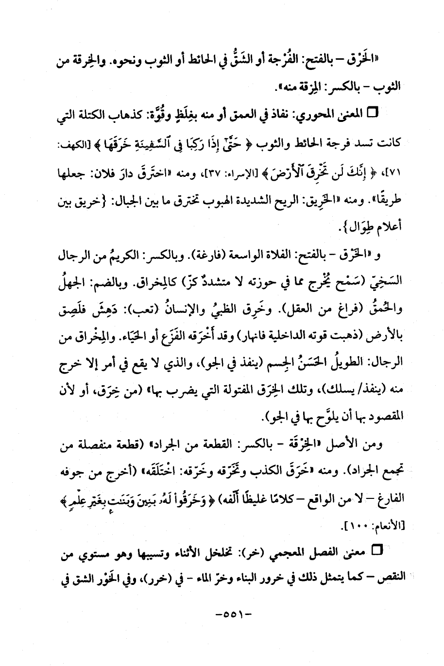 Qنفاذ في العمق أو منه بغِلَظٍ وقوَّة: كذهاب الكتلة التي كانت تسد فرجة الحائط والثوب {حَتَّى إِذَا رَكِبَا فِي السَّفِينَةِ خَرَقَهَا} [الكهف: 71]، {إِنَّكَ لَنْ تَخْرِقَ الْأَرْضَ} [الإسراء: 37] ومنه "اخترقَ دارَ فلان: جعلها طريقًا ". ومنه "الخَرِيق: الريح الشديدة الهبوب تخترق ما بين الجبال: (خريق بين أعلام طِوَال).