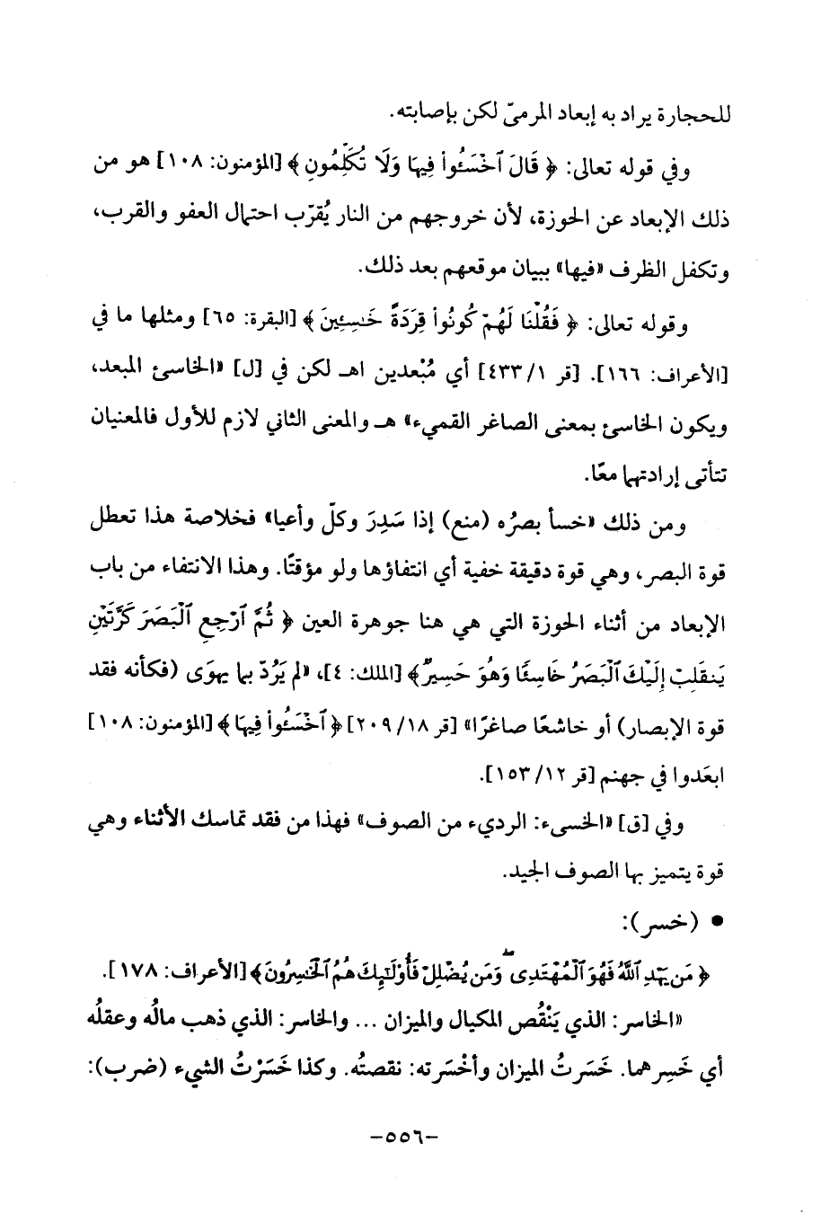 وقوله تعالى: {فَقُلْنَا لَهُمْ كُونُوا قِرَدَةً خَاسِئِينَ} [البقرة: 65] ومثلها ما في [الأعراف: 166] أي مُبْعدين اه لكن في [ل]، "الخاسئ المبعد، ويكون الخاسئ بمعنى الصاغر القميء "هـ والمعنى الثاني لازم للأول فالمعنيان تتأتى إرادتهما معًا.