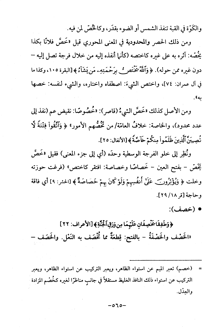 ومن ذلك الحصر والمحدودية في المعنى المحوري قيلا خَصَّ فلانًا بكذا يخُصّه: آثره به على غيره كاختصه (كأنما أنفذه إليه من خلال فرجة تصل إليه -دون غيره ممن حوله). {وَاللَّهُ يَخْتَصُّ بِرَحْمَتِهِ مَنْ يَشَاءُ} [البقرة: 105، وكذا ما في آل عمران: 74]، واختص الشيءَ: اصطفاه واختاره، والشيء لنفسه: خصها به ".