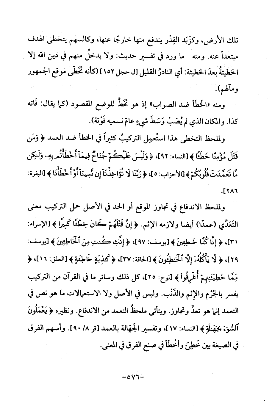 ولملحظ التخطى هذا استُعمِل التركيبُ كثيرًا في الخطأ ضد العمد {وَمَنْ قَتَلَ مُؤْمِنًا خَطَأً} [النساء: 92] {وَلَيْسَ عَلَيْكُمْ جُنَاحٌ فِيمَا أَخْطَأْتُمْ بِهِ وَلَكِنْ مَا تَعَمَّدَتْ قُلُوبُكُمْ} [الأحزاب: 5]، {رَبَّنَا لَا تُؤَاخِذْنَا إِنْ نَسِينَا أَوْ أَخْطَأْنَا} [البقرة: 286].