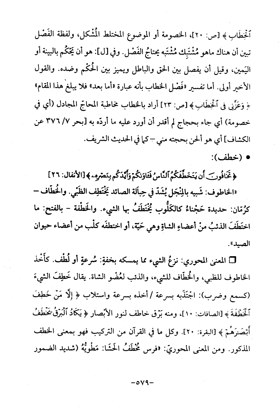 الْخِطَابِ} [ص: 20] الخصومة أو الموضوع المختلط المُشْكل، ولفظة الفَصْل تبين أن هناك ما هو مُشْتَبِك مُشْتَبه مجتاجُ الفَضل. وفي [ل]: هو أن يحكُم بالبينة أو اليَمين، وقيل أن يفصل بين الحق والباطل ويميز بين الحُكم وضده. والقول الأخير أولى. أما تفسير "فَصْل الخطاب بأنه عبارة "أما بعد "فلا يبلغ هذا المقام " {وَعَزَّنِي فِي الْخِطَابِ} [ص: 23] أراد بالخطاب مخاطبة المحاج المجادل (أي في خصومة) أي جاء بحجاج لم أقدر أن أورد عليه ما أردّه به [بحر 7/ 376 عن الكشاف] أي هو ألحن بحجته مني -كما في الحديث الشريف.