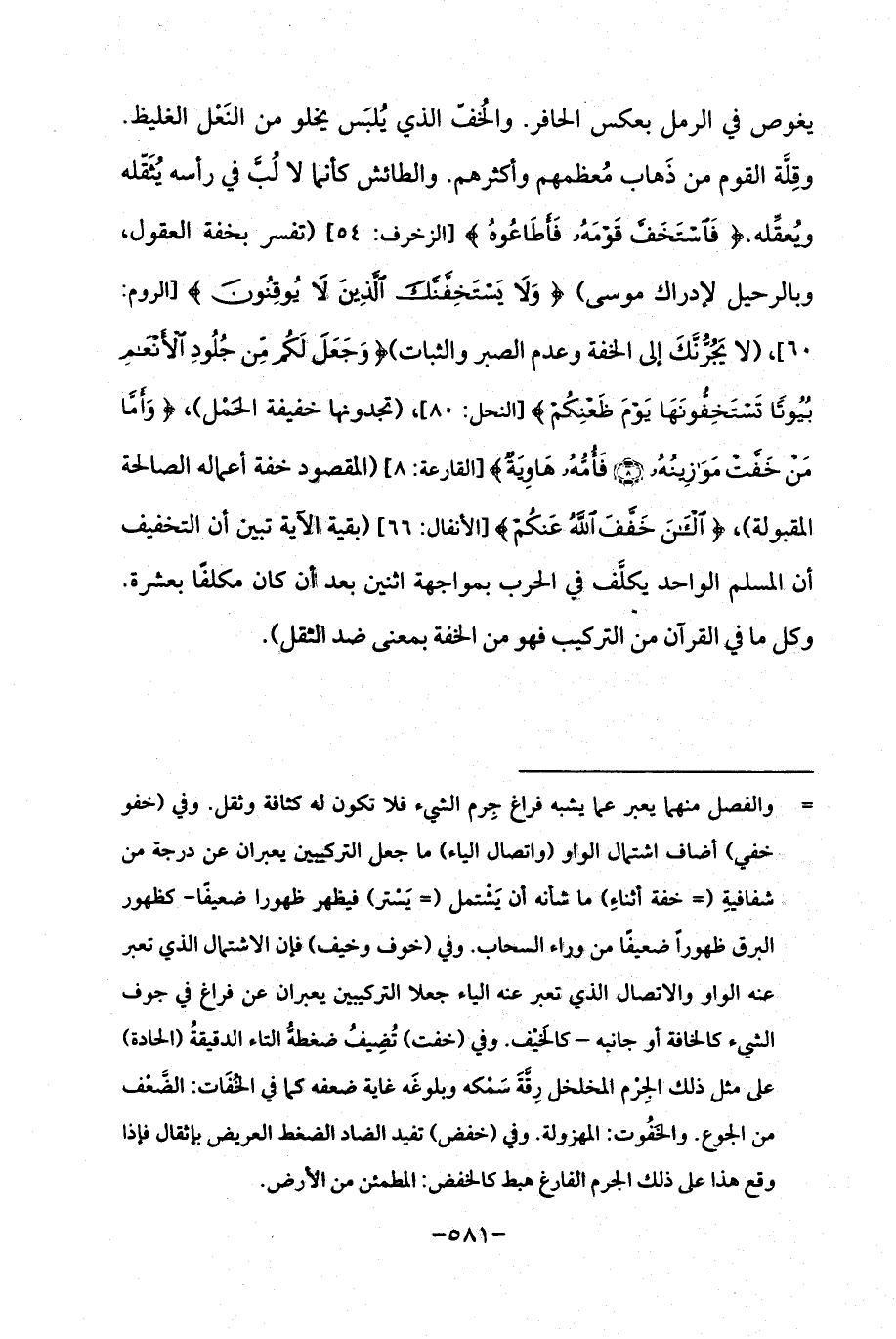 يغوص في الرمل بعكس الحافر. والخُفّ الذي يُلبَس يخلو من النَعل الغليظ. وقِلَّة القوم من ذَهاب مُعظمهم وأكثرهم. والطائش كأنما لا لُبَّ في رأسه يُثَقّله ويُعقِّله. {فَاسْتَخَفَّ قَوْمَهُ فَأَطَاعُوهُ} [الزخرف: 54] (تفسر بخفة العقول، وبالرحيل لإدراك موسى) {وَلَا يَسْتَخِفَّنَّكَ الَّذِينَ لَا يُوقِنُونَ} [الروم: 60]، (لا يجرُّنَكَ إلى الخفة وعدم الصبر والثبات) {وَجَعَلَ لَكُمْ مِنْ جُلُودِ الْأَنْعَامِ بُيُوتًا تَسْتَخِفُّونَهَا يَوْمَ ظَعْنِكُمْ} [النحل: 80]، (تجدونها خفيفة الحَمل)، {وَأَمَّا مَنْ خَفَّتْ مَوَازِينُهُ (8) فَأُمُّهُ هَاوِيَةٌ} [القارعة: 8، 9] (المقصود خفة أعماله الصالحة المقبولة)، {الْآنَ خَفَّفَ اللَّهُ عَنْكُمْ} [الأنفال: 66] (بقية الآية تبين أن التخفيف أن المسلم الواحد يكلَّف في الحرب بمواجهة اثنين بعد أن كان مكلفًا بعشرة. وكل ما في القرآن من التركيب فهو من الخفة بمعنى ضد الثقل).