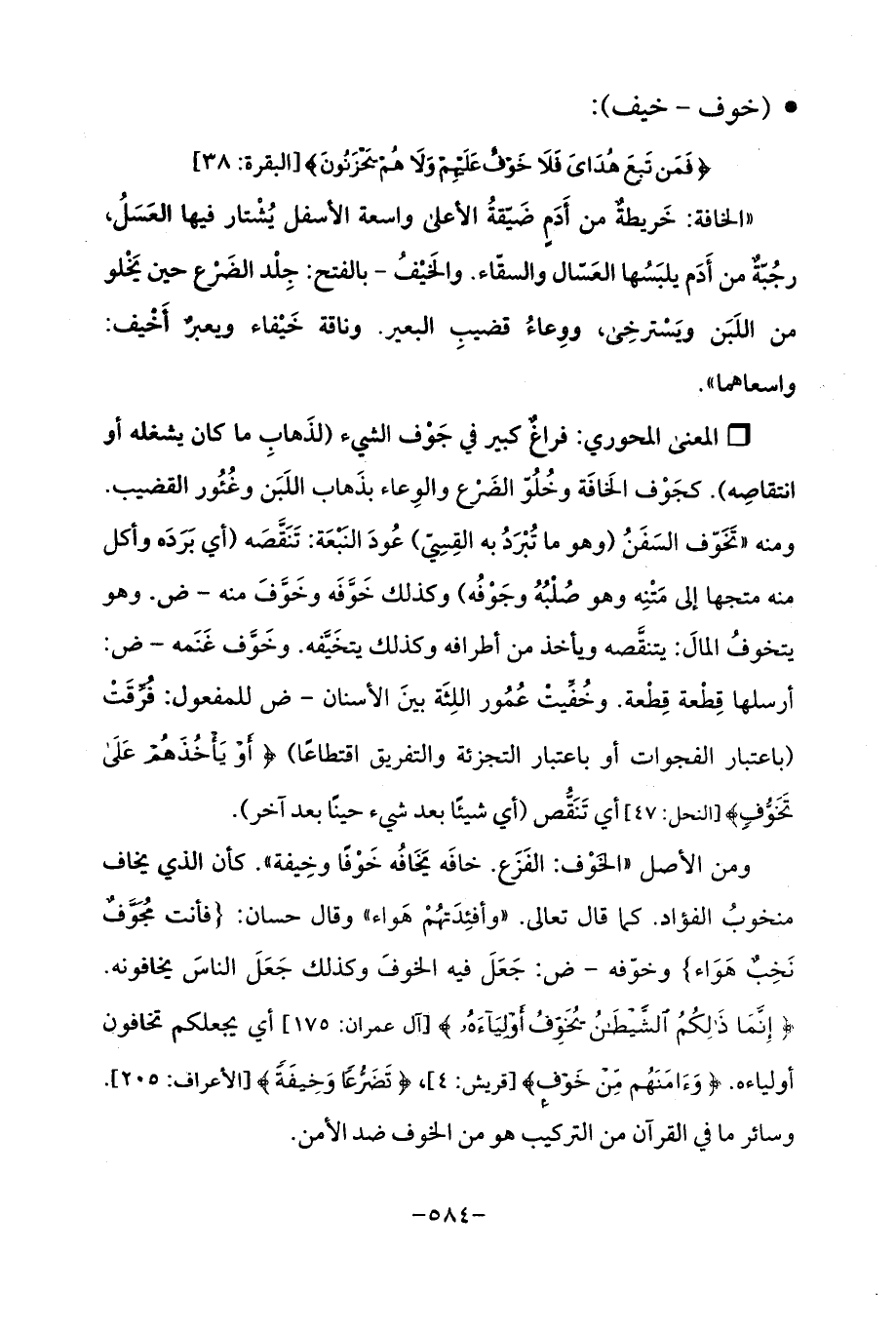 ومن الأصل: الخَوف: الفَزَع. خافَه يَخَافُه خَوْفًا وخِيفة ". كأن الذي يخاف منخوبُ الفؤاد. كما قال تعالى. "وأفئِدَتهُمْ هَواء "وقال حسان: (فأنت مُجَوَّفٌ نَخِبٌ هَوَاء) وخوفه -ض: جَعَلَ فيه الخوفَ وكذلك جَعَلَ الناسَ يخافونه. {إِنَّمَا ذَلِكُمُ الشَّيْطَانُ يُخَوِّفُ أَوْلِيَاءَهُ} [آل عمران: 175] أي يجعلكم تخافون أولياءه. {وَآمَنَهُمْ مِنْ خَوْفٍ} [قريش: 4] {تَضَرُّعًا وَخِيفَةً} [الأعراف: 205]. وسائر ما في القرآن من التركيب هو من الخوف ضد الأمن.