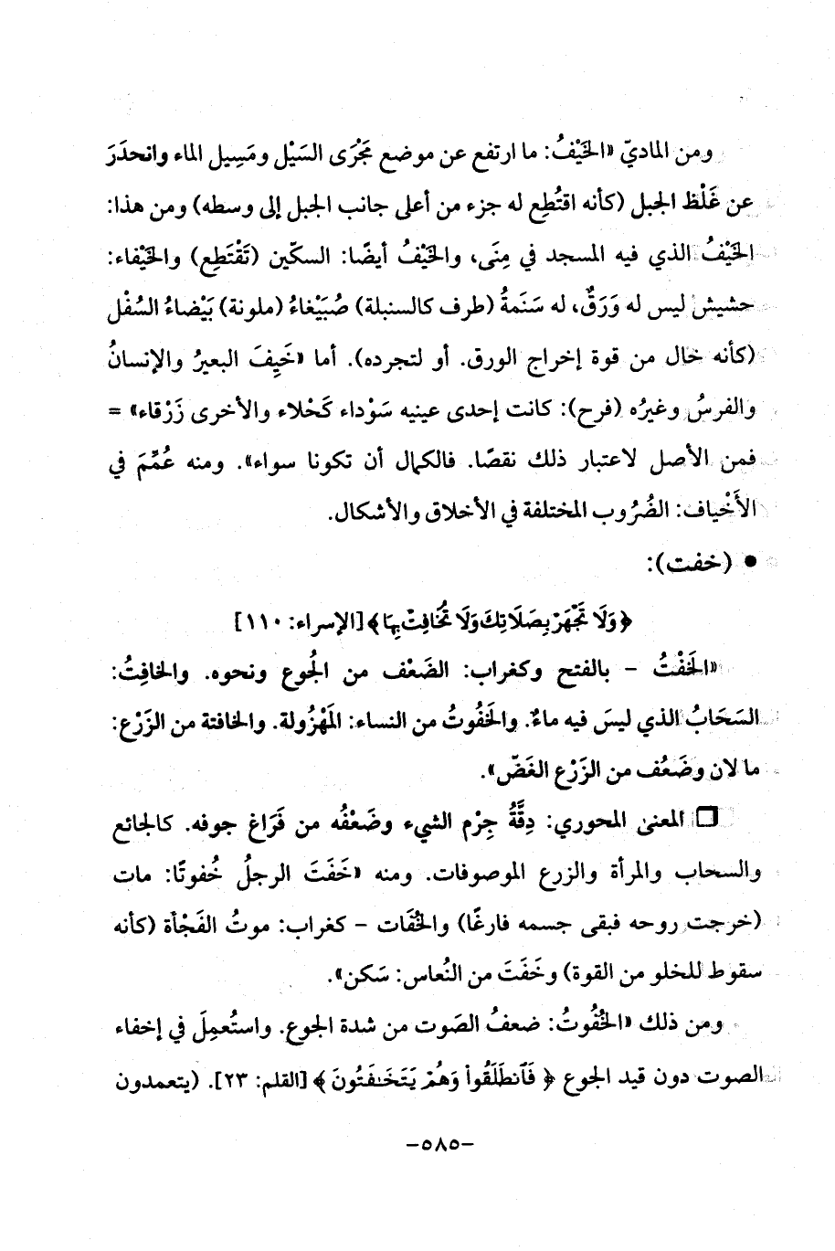 ومن ذلك "الخُفوتُ: ضعفُ الصَوت من شدة الجوع. واستعمِلَ في إخفاء الصوت. دون قيد الجوع {فَانْطَلَقُوا وَهُمْ يَتَخَافَتُونَ (23)} [القلم: 23]. (يتعمدون