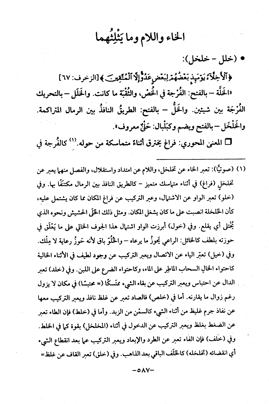 (¬1) (صوتيًّا): تعبر الخاء عن تخلخل، واللام عن استقلال، والفصل منهما يعبر عن تخلخل (فراغ) في أثناء متماسك يتميز -كالطريق النافذ بين الرمال مكتنفا بها. وفي (خلو) تعبر الواو عن الاشتمال، وعبر التركيب عن فراغ المكان مما كان يشتمل عليه، كأن الخلخلة انصبت على ما كان يشغل المكان. ومثل ذلك الخلى الحشيش ونحوه الذي يُخْتلى أي يقلع. وفي (خول) أبرزت الواو اشتمال هذا الجوف الخالي على ما يَعلَق في حوزته بلطف كالخائل: الراعي مَجوزُ ما يرعاه -والخلُو باق لأنه حَوزُ رعاية لا مِلْكٌ. وفي (خيل) تعبَر الياء عن الاتصال ويعبر التركيب عن وجودْ لطيف في الأثناء الخالية كاحتواء الخالِ السحاب الماطر على الماء، وكاحتواء الضرع على اللبن. وفي (خلد) تعبر الدال عن احتباس ويعبر التركيب عن بقاء الشيء ممتَسكًا (= محتسبا) في مكان لا يزول رغم زوال ما يقارنه. أما في (خلص) فالصاد تعبر عن غلظ نافذ ويعبر التركيب معها عن نفاذ جرم غليظ من أثناء الشيء كالسمن من الزبد. وأما في (خلط) فإن الطاء تعبر على الضغط بغلظ ويعبر التركيب عن الدخول في أثناء (المخلخل) بقوة كما في الخلط. وفي (خلف) فإن الفاء تعبر عن الطرد والإبعاد ويعبر التركيب عما بعد انقطاع الشيء أي انقضائه (تخلخله) كالخلَف الباقي بعد الذاهب. وفي (خلق) تعبر القاف عن غلظ =