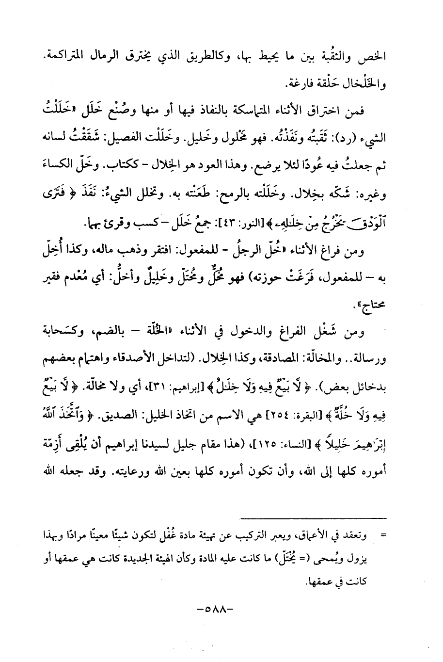 ومن شَغْل الفراغ والدخول في الأثناء (الخلة -بالضم، وكسَحابة ورسالة .. والمخالة: المصادقة، وكذا الخِلال. (لتداخل الأصدقاء واهتمام بعضهم بدخائل بعض). {لَا بَيْعٌ فِيهِ وَلَا خِلَالٌ} [إبراهيم: 31] أي ولا مخالّة. {لَا بَيْعٌ فِيهِ وَلَا خُلَّةٌ} [البقرة: 254] هي الاسم من اتخاذ الخليل: الصديق. {وَاتَّخَذَ اللَّهُ إِبْرَاهِيمَ خَلِيلًا} [النساء: 125]، (هذا مقام جليل لسيدنا إبراهيم أن يُلْقِى أزِمة أموره كلها إلى الله، وأن تكون أموره كلها بعين الله ورعايته. وقد جعله الله
