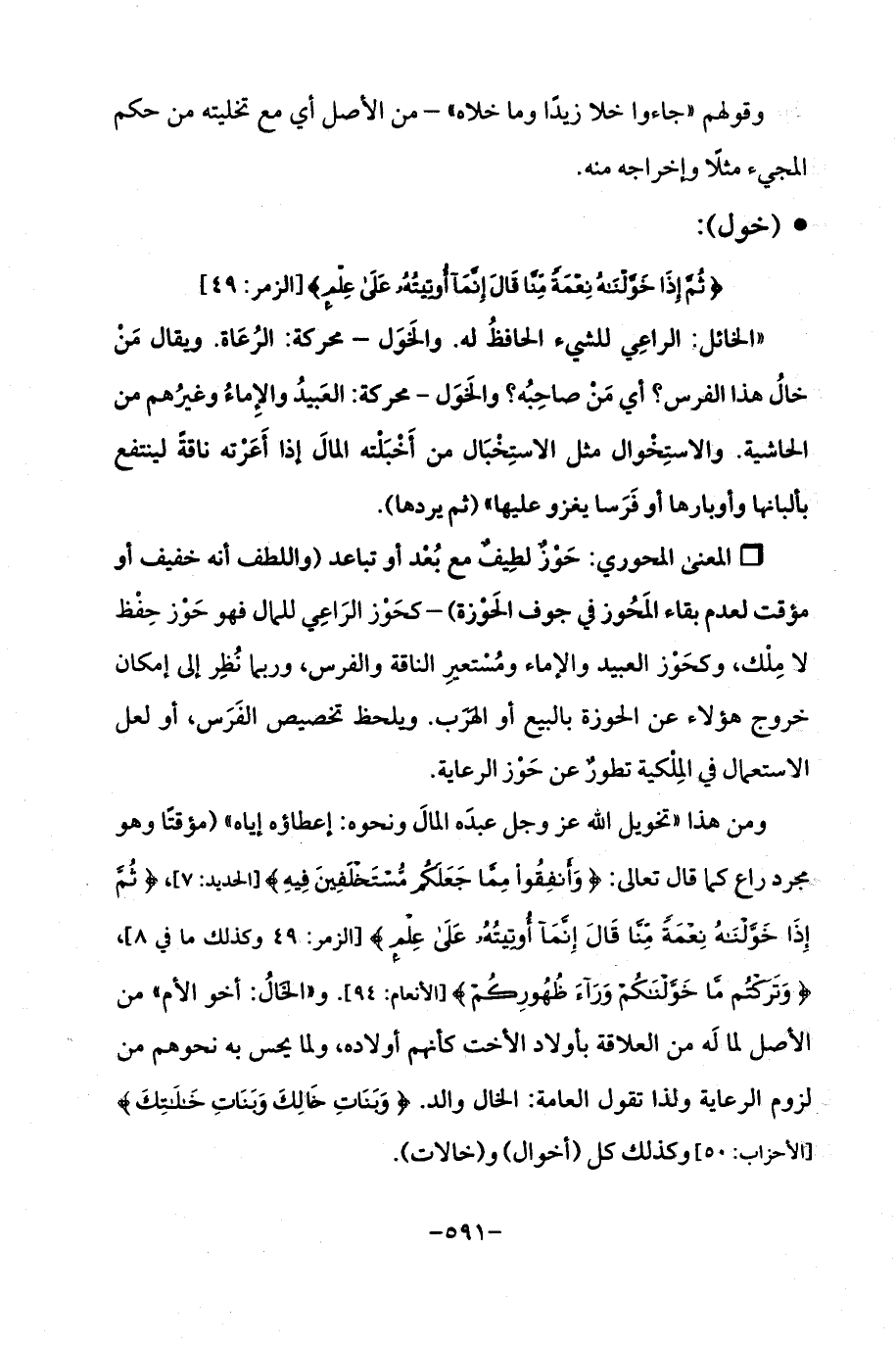 ومن هذا "تخويل الله عَزَّ وَجَلَّ عبدَه المالَ ونحوه: إعطاؤه إياه " (مؤقتًا وهو مجرد راع كما قال تعالى: {وَأَنْفِقُوا مِمَّا جَعَلَكُمْ مُسْتَخْلَفِينَ فِيهِ} [الحديد: 7]، {ثُمَّ إِذَا خَوَّلْنَاهُ نِعْمَةً مِنَّا قَالَ إِنَّمَا أُوتِيتُهُ عَلَى عِلْمٍ} [الزمر: 49] وكذلك ما في 8]، {وَتَرَكْتُمْ مَا خَوَّلْنَاكُمْ وَرَاءَ ظُهُورِكُمْ} [الأنعام: 94]. و "الخالُ: أخو الأم "من الأصل لما لَه من العلاقة بأولاد الأخت كأنهم أولاده، ولما يحس به نحوهم من لزوم الرعاية ولذا تقول العامة: الخال والد. {وَبَنَاتِ خَالِكَ وَبَنَاتِ خَالَاتِكَ} [الأحزاب: 50] وكذلك كل (أخوال) و (خالات).