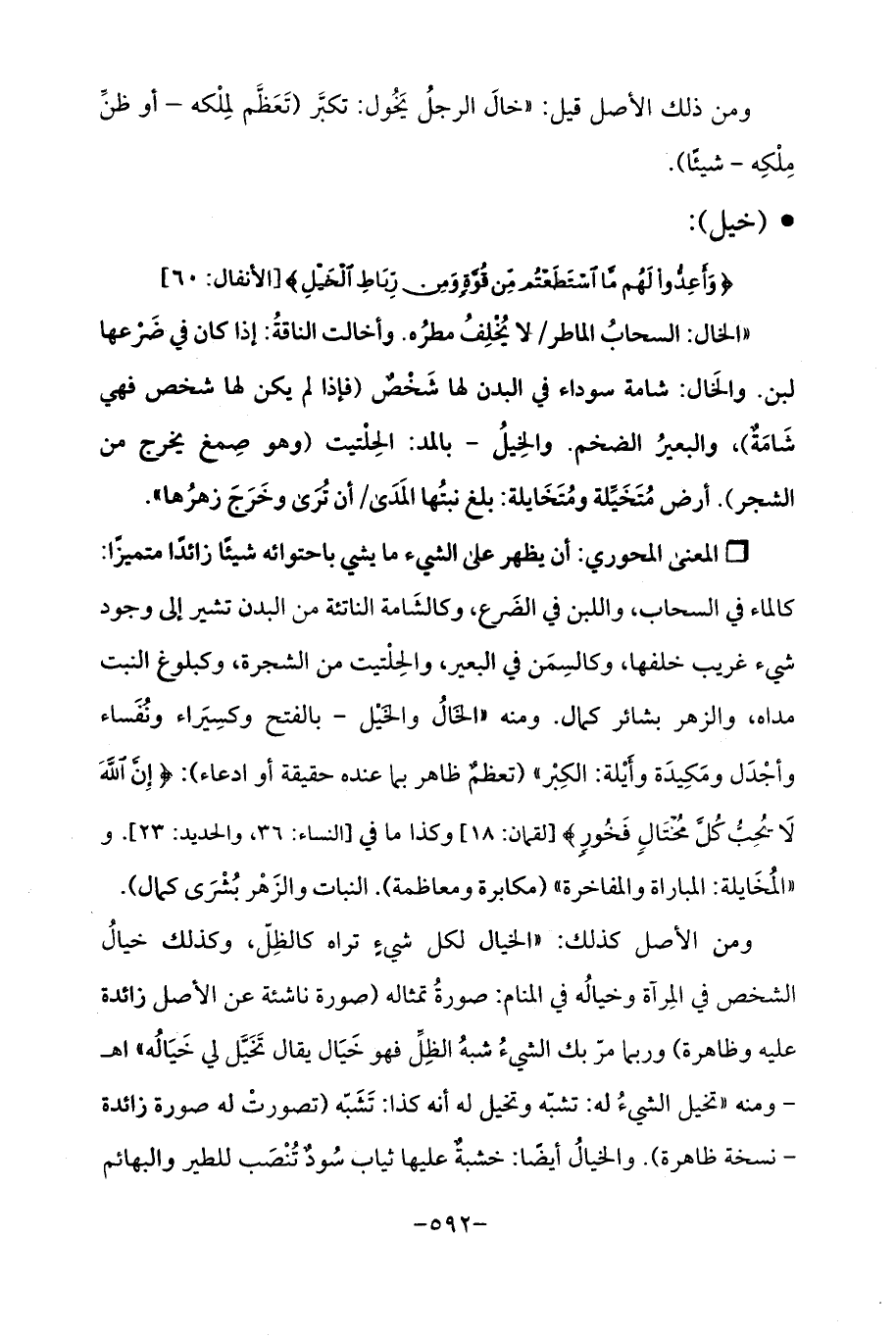 Qأن يظهر على الشيء ما يشي باحتوائه شيئًا زائدًا متميزًا: كالماء في السحاب، واللبن في الضَرع، وكالشامة الناتئة من البدن تشير إلى وجود شيء غريب خلفها، وكالسِمَن في البعير، والحِلتيت من الشجرة، وكبلوغ النبت مداه، والزهر بشائر كمال. ومنه "الخالُ والخَيْل -بالفتح وكِسيراء ونُفَساء وأجْدَل ومَكِيدَة وأيْلة: الكِبر " (تعظمٌ ظاهر بما عنده حقيقة أو ادعاء): {إِنَّ اللَّهَ لَا يُحِبُّ كُلَّ مُخْتَالٍ فَخُورٍ} [لقمان: 18] وكذا ما في [النساء: 36، والحديد: 23]. و "المُخَايلة: المباراة والمفاخُرة) (مكابرة ومعاظمة). النبات والزَهْر بُشْرَى كمال).