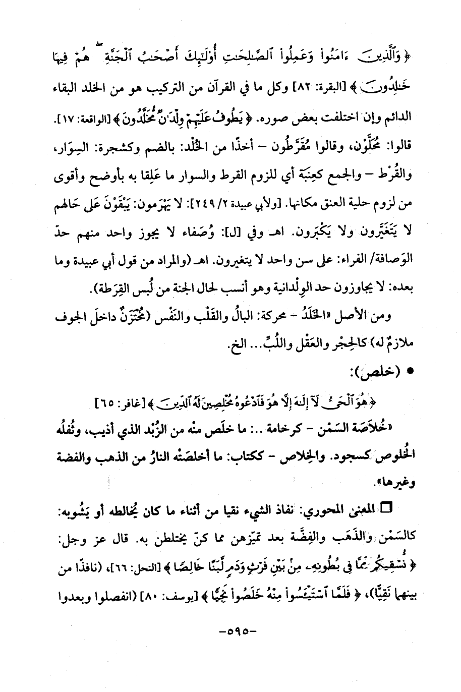 {وَالَّذِينَ آمَنُوا وَعَمِلُوا الصَّالِحَاتِ أُولَئِكَ أَصْحَابُ الْجَنَّةِ هُمْ فِيهَا خَالِدُونَ (82)} [البقرة: 82] وكل ما في القرآن من التركيب هو من الخلد البقاء الدائم وإن اختلفت بعض صوره. {يَطُوفُ عَلَيْهِمْ وِلْدَانٌ مُخَلَّدُونَ (17)} [الواقعة: 17]. قالوا: مُحلون، وقالوا مُقَرطُون -أخذًا من الخُلد: بالضم وكشجرة: السِوَار، والقُرط -والجمع كعِنبَة أي للزوم القرط والسوار ما عَلِقا به بأوضح وأقوى من لزوم حلية العنق مكانها. [ولأبي عبيدة 2/ 249]: لا يهْرَمون: يَبْقَوْنَ عَلى حَالهم لا يَتَغَيرون ولا يَكبَرون. اه وفي [ل]: وُصَفاء لا يجوز واحد منهم حدّ الوَصافة الفراء: على سن واحد لا يتغيرون. اه (والمراد من قول أبي عبيدة وما بعده: لا يجاوزون حد الوِلْدانية وهو أنسب لحال الجنة من لُبس القِرَطة).