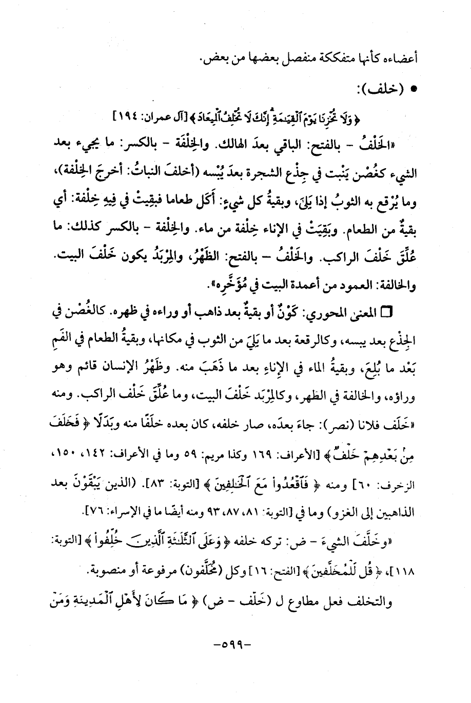 Qكَوْن أو بقية بعد ذاهب أو وراءه في ظهره. كالغُصن في الجِذْع بعد يبسه، وكالرقعة بعد ما يليَ من الثوب في مكانها، وبقيةُ الطعام في الفَمِ بَعْد ما بُلِعَ، وبقيةُ الماء في الإِناءِ بعد ما ذَهَبَ منه. وظَفرُ الإنسان قائم وهو وراؤه، والخالفة في الظهر، وكالمِربَد خَلْفَ البيت، وما عُلقَ خَلف الراكب. ومنه "خَلَف فلانا (نصر): جاءَ بعدَه، صار خلفه، كان بعده خلَفًا منه وبَدَلا {فَخَلَفَ مِنْ بَعْدِهِمْ خَلْفٌ} [الأعراف: 169 وكذا مريم: 59 وما في الأعراف: 142، 150، الزخرف: 60] ومنه {فَاقْعُدُوا مَعَ الْخَالِفِينَ} [التوبة: 83]. (الذين يَبْقَوْنَ بعد الذاهبين إلى الغزو) وما في [التوبة: 81، 87، 93 ومنه أيضًا ما في الإسراء: 76].