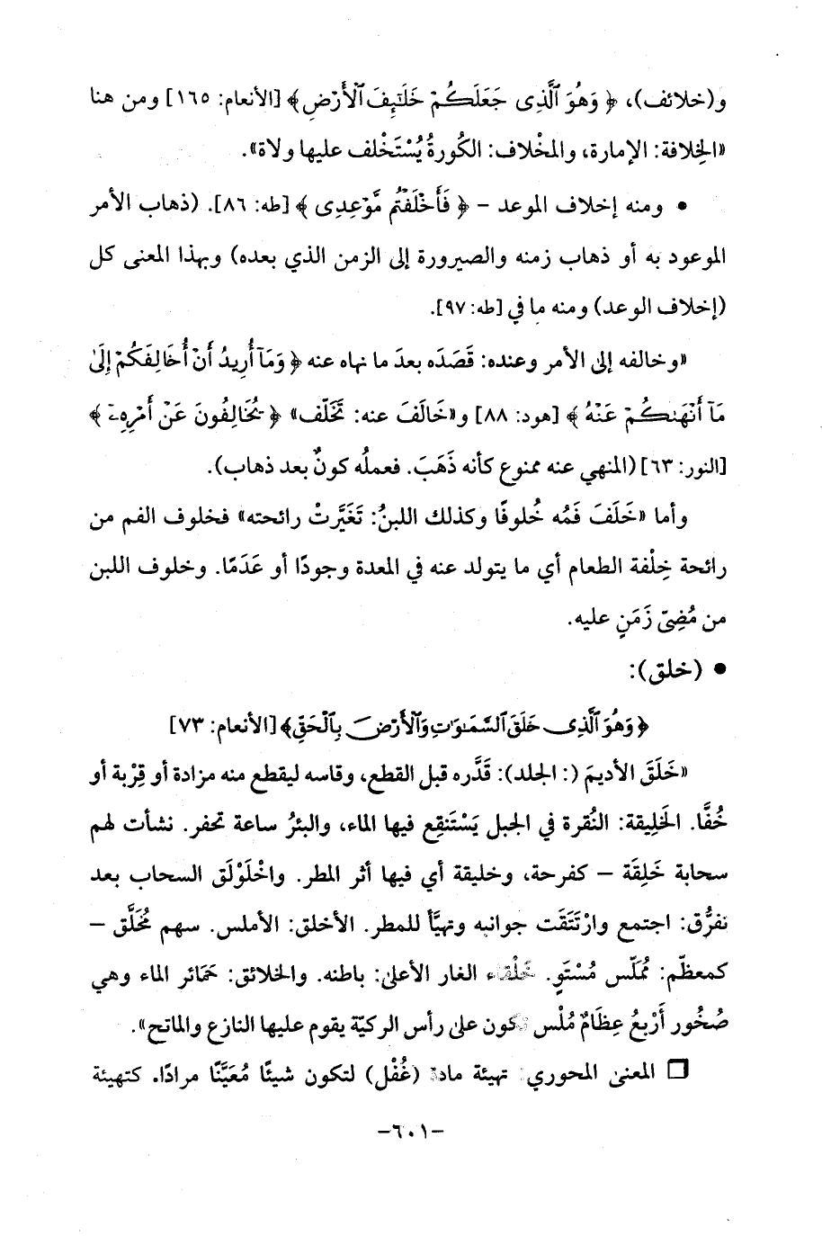 "وخالفه إلى الأمر وعنده: قَصَدَه بعدَ ما نهاه عنه {وَمَا أُرِيدُ أَنْ أُخَالِفَكُمْ إِلَى مَا أَنْهَاكُمْ عَنْهُ} [هود: 88] و "خَالَفَ عنه: تخَلَف " {يُخَالِفُونَ عَنْ أَمْرِهِ} [النور: 63] (المنهي عنه ممنوع كأنه ذَهَبَ. فعملُه كونٌ بعد ذهاب).