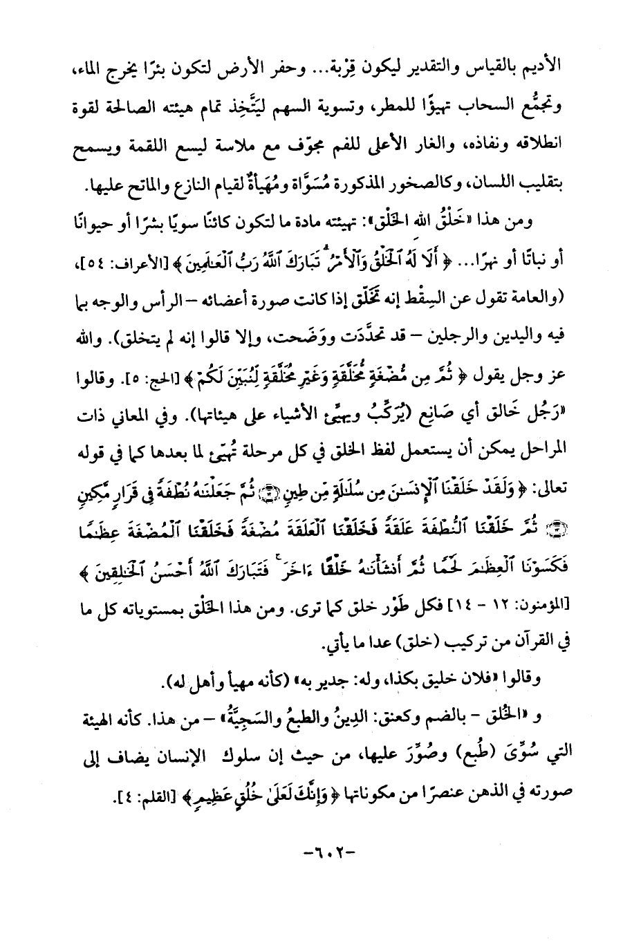 ومن هذا "خَلْقُ الله الخَلْق ": تهيئته مادة ما لتكون كائنًا سويًا بشرًا أو حيوانًا أو نباتًا أو نهرًا ... {أَلَا لَهُ الْخَلْقُ وَالْأَمْرُ تَبَارَكَ اللَّهُ رَبُّ الْعَالمِينَ} [الأعراف: 54]، (والعامة تقول عن السِقط إنه تخَلّق إذا كانت صورة أعضائه -الرأس والوجه بما فيه واليدين والرجلين- قد تحدَّدَت ووَضَحت، وإلا قالوا إنه لم يتخلق). والله عَزَّ وَجَلَّ يقول {ثُمَّ مِنْ مُضْغَةٍ مُخَلَّقَةٍ وَغَيْرِ مُخَلَّقَةٍ لِنُبَيِّنَ لَكُمْ} [الحج: 5]. وقالوا "رَجُل خَالق أي صَانِع (يركِّبُ ويهيِّئ الأشياء على هيئاتها). وفي المعاني ذات المراحل يمكن أن يستعمل لفظ الخلق في كل مرحلة تُهيّئ لما بعدها كما في قوله تعالى: {وَلَقَدْ خَلَقْنَا الْإِنْسَانَ مِنْ سُلَالَةٍ مِنْ طِينٍ (12) ثُمَّ جَعَلْنَاهُ نُطْفَةً فِي قَرَارٍ مَكِينٍ (13) ثُمَّ خَلَقْنَا النُّطْفَةَ عَلَقَةً فَخَلَقْنَا الْعَلَقَةَ مُضْغَةً فَخَلَقْنَا الْمُضْغَةَ عِظَامًا فَكَسَوْنَا الْعِظَامَ لَحْمًا ثُمَّ أَنْشَأْنَاهُ خَلْقًا آخَرَ فَتَبَارَكَ اللَّهُ أَحْسَنُ الْخَالِقِينَ} [المومنون: 12 - 14] فكل طَوْر خلق كما ترى. ومن هذا الخَلْق بمستوياته كل ما في القرآن من تركيب (خلق) عدا ما يأتي.