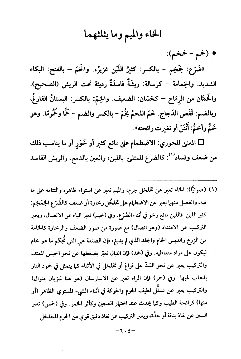 (¬1) (صوتيًّا): الخاء تعبر عن تخلخل جرم، والميم تعبر عن استواء ظاهره والتئامه على ما فيه، والفصل منهما يعبر عن الاضطمام على تخلخُل رخاوة أو ضعف كالضَّرْع الخِمْخِم: كثير اللبن. فاللبن مائع رخو في أثناء الصَّرْع. وفي (خيم) تعبر الياء عن الاتصال، ويعبر التركيب عن الامتداد (وهو اتصال) مع صورة من صور الضعف والرخاوة كالخامة من الزرع والدبس الخام والجلد الذي لم يدبغ، فإن الصنعة هي التي تُحِكم ما هو خام ليكون على مراد متعاطيه. وفي (خمد) فإن الدال تعبّر بضغطها عن نحو الحبس الممتد، والتركيب يعبر عن نحو السَدّ على فراغ أو تخلخل في الأثناء كما يتمثل في خمود النار بذهاب لهبها. وفي (خمر) فإن الراء تعبر في الاسترسال (هو هنا سَرَيان متوال) والتركيب يعبر عن تسلُّل لطيف الجرم والحركة في أثناء الشيء المستوي الظاهر (أو منها) كرائحة الطيب وكما يحدث عند اختمار العجين وكأثر الخمر. وفي (خمس) تعبر السين عن نفاذ بدقة أو حدَّة، ويعبر التركيب عن نفاذ دقيق قوي من الجرم المخلخل =