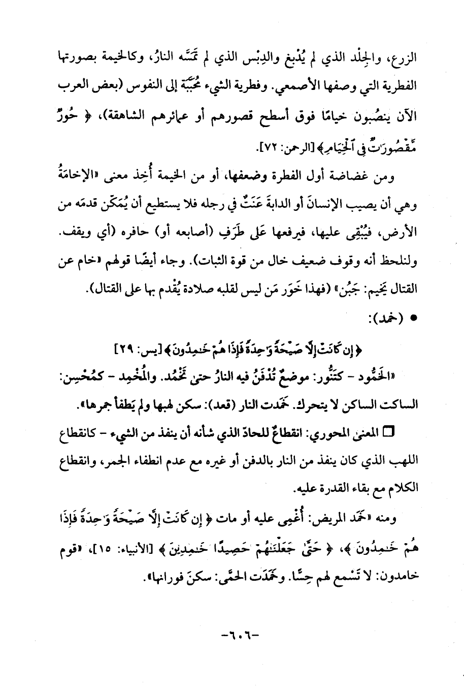 ومنه "خَمَد المريض: أُغْمِى عليه أو مات {إِنْ كَانَتْ إِلَّا صَيْحَةً وَاحِدَةً فَإِذَا هُمْ خَامِدُونَ}، {حَتَّى جَعَلْنَاهُمْ حَصِيدًا خَامِدِينَ} [الأنبياء: 15]، "قوم خامدون: لا تَسْمع لهم حِسًّا. وخَمَدَت الحمَّى: سكنَ فورانها ".