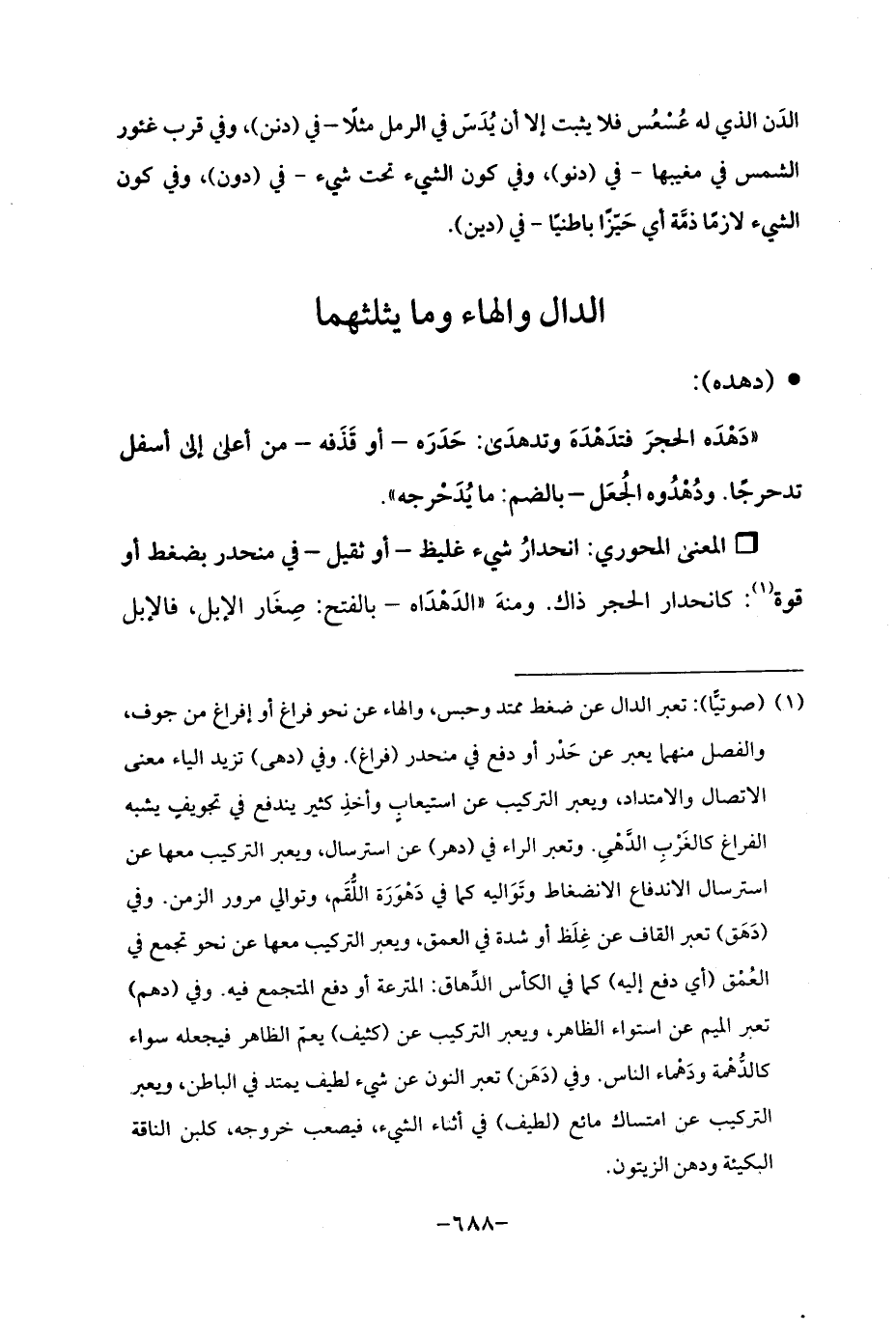 (¬1) (صوتيًّا): تعبر الدال عن ضغط ممتد وحبس، والهاء عن نحو فراغ أو إفراغ من جوف، والفصل منهما يعبر عن حَدْر أو دفع في منحدر (فراغ). وفي (دهى) تزيد الياء معنى الاتصال والامتداد، ويعبر التركيب عن استيعابٍ وأخذِ كثير يندفع في تجويفٍ يشبه الفراغ كالغَرْبِ الدَّهْي. وتعبر الراء في (دهر) عن استرسال، ويعبر التركيب معها عن استرسال الاندفاع الانضغاط وتَوَاليه كما في دَهْوَرَة اللُّقَم، وتوالي مرور الزمن. وفي (دَهَق) تعبر القاف عن غِلَظ أو شدة في العمق، ويعبر الزكيب معها عن نحو تجمع في العُمْق (أي دفع إليه) كما في الكأس الدِّهاق: المترعة أو دفع المتجمع فيه. وفي (دهم) تعبر الميم عن استواء الظاهر، ويعبر التركيب عن (كثيف) يعمّ الظاهر فيجعله سواء كالدُّهْمة ودَهْماء الناس وفي (دَهَن) تعبر النون عن شيء لطيف يمتد في الباطن، ويعبر التركيب عن امتساك مائع (لطيف) في أثناء الشيء، فيصعب خروجه، كلبن الناقة البكئة ودهن الزيتون.