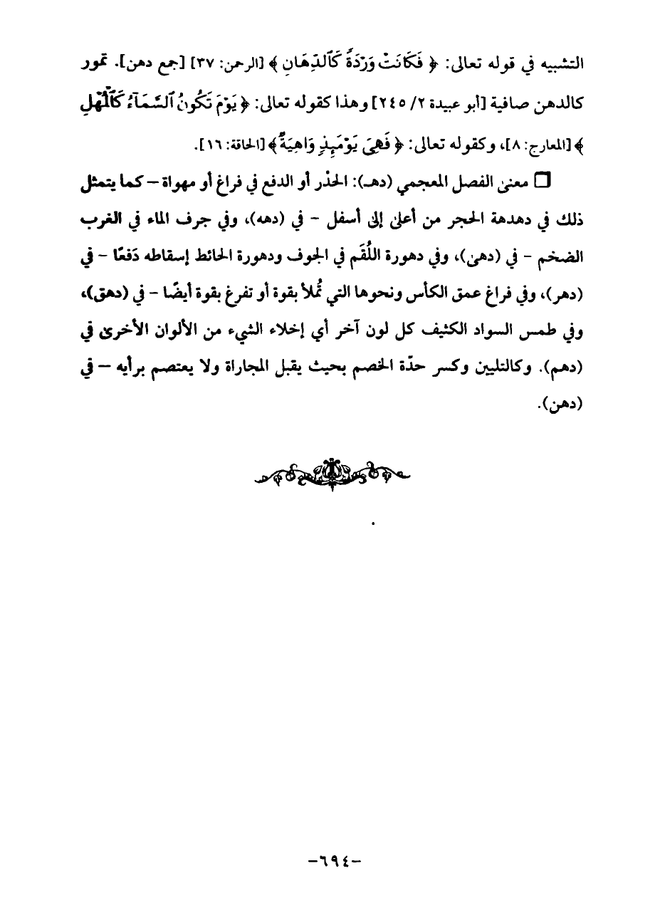 ° معنى الفصل المعجمي (ده): الحدْر أو الدفع في فراغ أو مهواة -كما يتمثل ذلك في دهدهة الحجر من أعلى إلى أسفل -في (دهه)، وفي جرف الماء في الغرب الضخم -في (دهى)، وفي دهورة اللُقَم في الجوف ودهورة الحائط إسقاطه دَفعًا -في (دهر)، وفي فراغ عمق الكأس ونحوها التي تُملأ بقوة أو تفرغ بقوة أيضًا -في (دهق)، وفي طمس السواد الكثيف كل لون آخر أي إخلاء الشيء من الألوان الأخرى في (دهم). وكالتليين وكسر حدّة الخصم بحيث يقبل المجاراة ولا يعتصم برأيه -في (دهن).