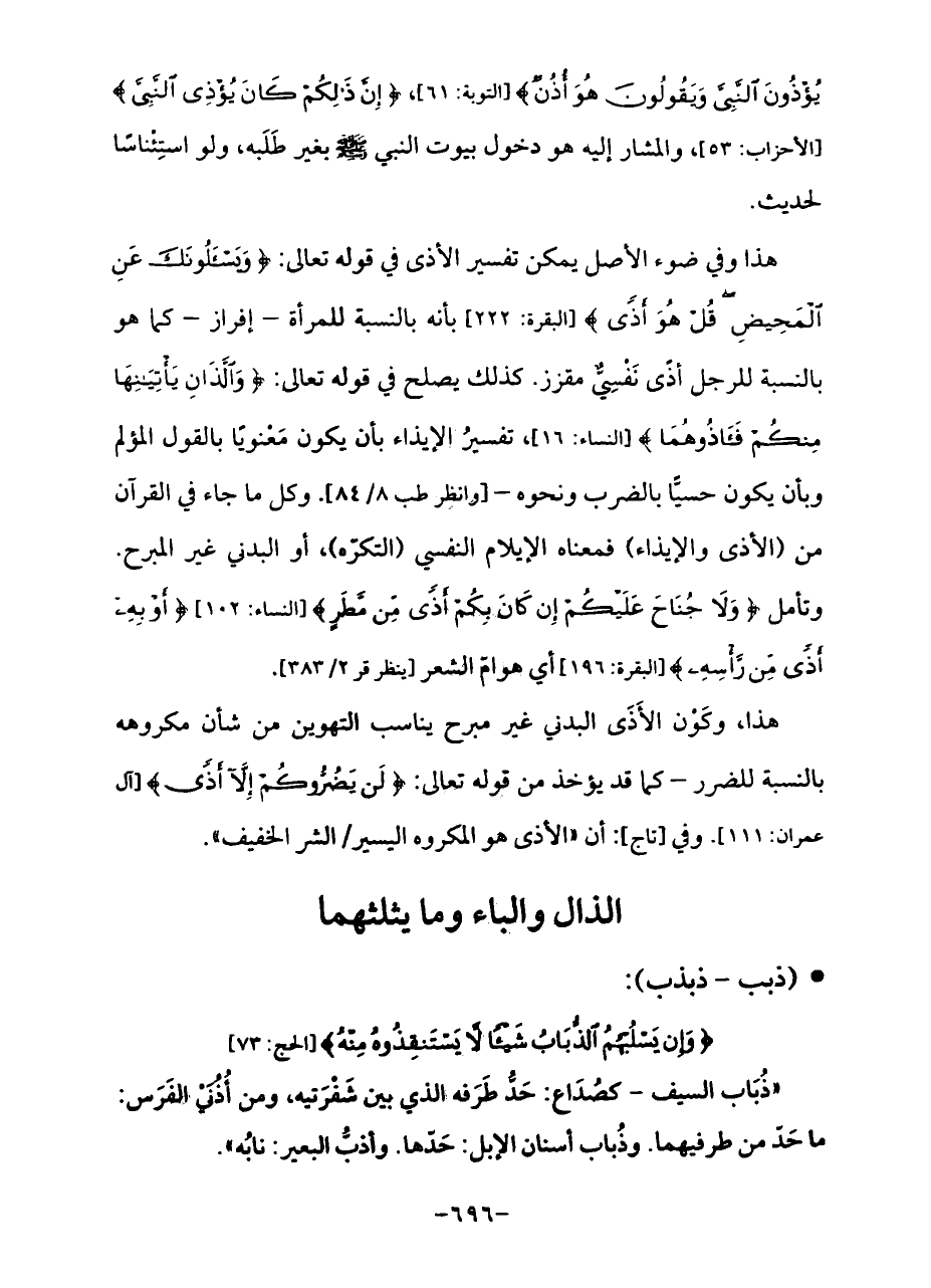 هذا وفي ضوء الأصل يمكن تفسير الأذى في قوله تعالى: {وَيَسْأَلُونَكَ عَنِ الْمَحِيضِ قُلْ هُوَ أَذًى} [البقرة: 222] بأنه بالنسبة للمرأة -إفراز- كما هو بالنسبة للرجل أذًى نَفْسِيٌّ مقزز. كذلك يصلح في قوله تعالى: {وَاللَّذَانِ يَأْتِيَانِهَا مِنْكُمْ فَآذُوهُمَا} [النساء: 16]، تفسيرُ الإيذاء بأن يكون مَعْنويًا بالقول المؤلم وبأن يكون حسيًّا بالضرب ونحوه -[وَانظر طب 8/ 84]. وكل ما جاء في القرآن من (الأذى والإيذاء) فمعناه الإيلام النفسي (التكرّه)، أو البدني غير المبرح. وتأمل {وَلَا جُنَاحَ عَلَيْكُمْ إِنْ كَانَ بِكُمْ أَذًى مِنْ مَطَرٍ} [النساء: 102] {أَوْ بِهِ أَذًى مِنْ رَأْسِهِ} [البقرة: 196] أي هوامّ الشعر [ينظر قر 2/ 383].