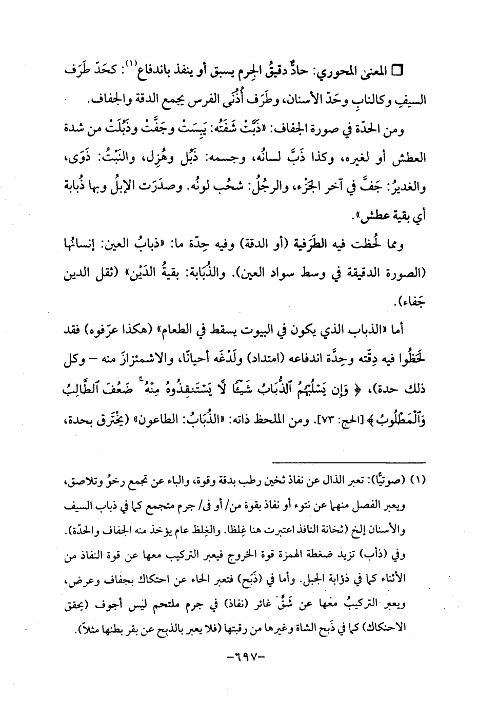 (¬1) (صوتيًّا): تعبر الذال عن نفاذ ثخين رطب بدقة وقوة، والباء عن تجمع رخوُ وتلاصق، ويعبر الفصل منهما عن نتوء أو نفاذ بقوة من/ أو فى/ جرم متجمع كما في ذباب السيف والأسنان إلخ (ثخانة النافذ اعتبرت هنا غِلظا. والغِلظ عام يؤخذ منه الجفاف والحدّة). وفي (ذأب) تزيد ضغطة الهمزة قوة الخروج فيعبر التركيب معها عن قوة النفاذ من الأثناء كما في ذؤابة الجبل. واما في (ذَبَح) فتعبر الحاء عن احتكاك بجفاف وعرض، ويعبر التركيبُ معها عن شَقٍّ غائر (نفاذ) في جرم ملتحم ليس أجوف (يحقق الاحنكاك) كما في ذَبح الشاة وغيرها من رقبتها (فلا يعبر بالذبح عن بقر بطنها مثلًا).