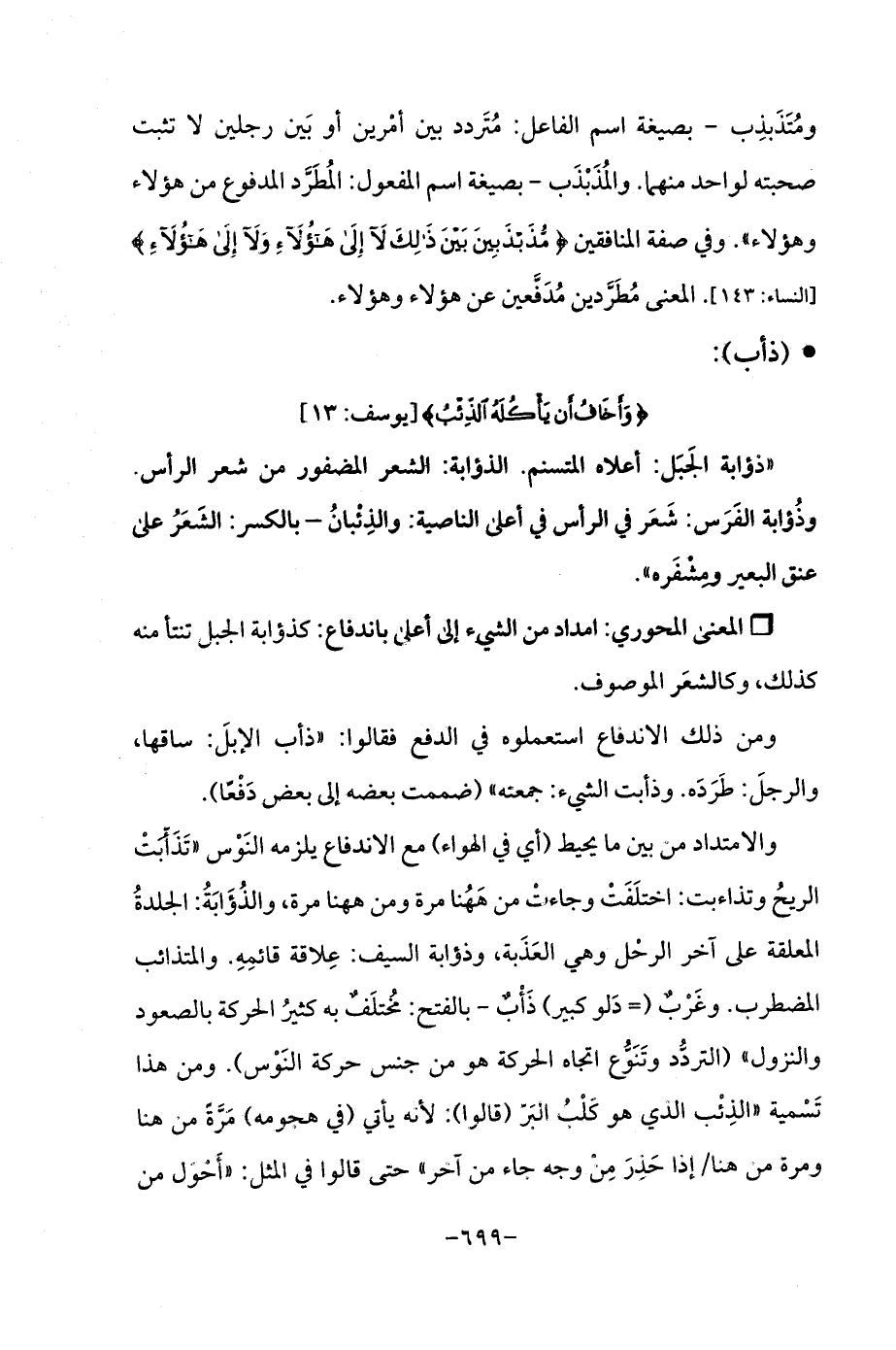 ومن ذلك الاندفاع استعملوه في الدفع فقالوا: "ذأب الإبلَ: ساقها، والرجلَ: طَرَدَه. وذأبت الشيء: جمعته " (ضممت بعضه إلى بعض دَفْعًا).