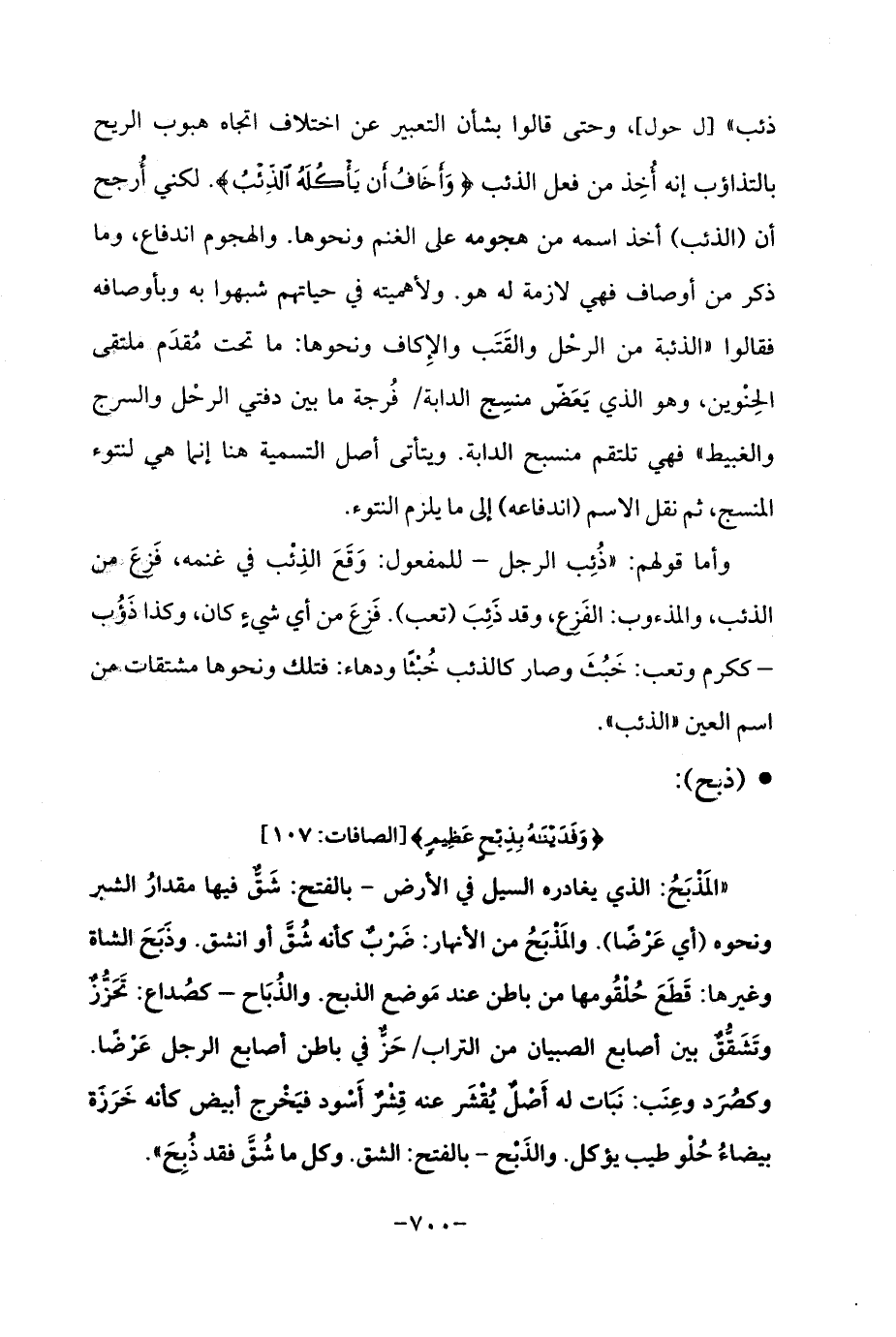 "المَذْبَحُ: الذي يغادره السيل في الأرض -بالفتح: شَقٌّ فيها مقدارُ الشبر ونحوه (أي عَرْضًا). والمَذبَحُ من الأنهار: ضَرْبٌ كأنه شُقَّ أو انشق. وذَبَحَ الشاة وغيرها: قَطَعَ حُلْقُومها من باطن عند مَوضع الذبح. والذُبَاح -كصُداع: تَحَزُّزٌ وتَشَقُّقٌ بين أصابع الصبيان من التراب/ حَزٌّ في باطن أصابع الرجل عَرْضًا. وكصُرَد وعِنَب: نَبَات له أَصْلٌ يُقْشَر عنه قِشْرٌ أَسْود فيَخْرج أبيض كأنه خَرَزَة بيضاءُ حُلْو طيب يؤكل. والذَبْح -بالفتح: الشق. وكل ما شُقَّ فقد ذُبِحَ ".