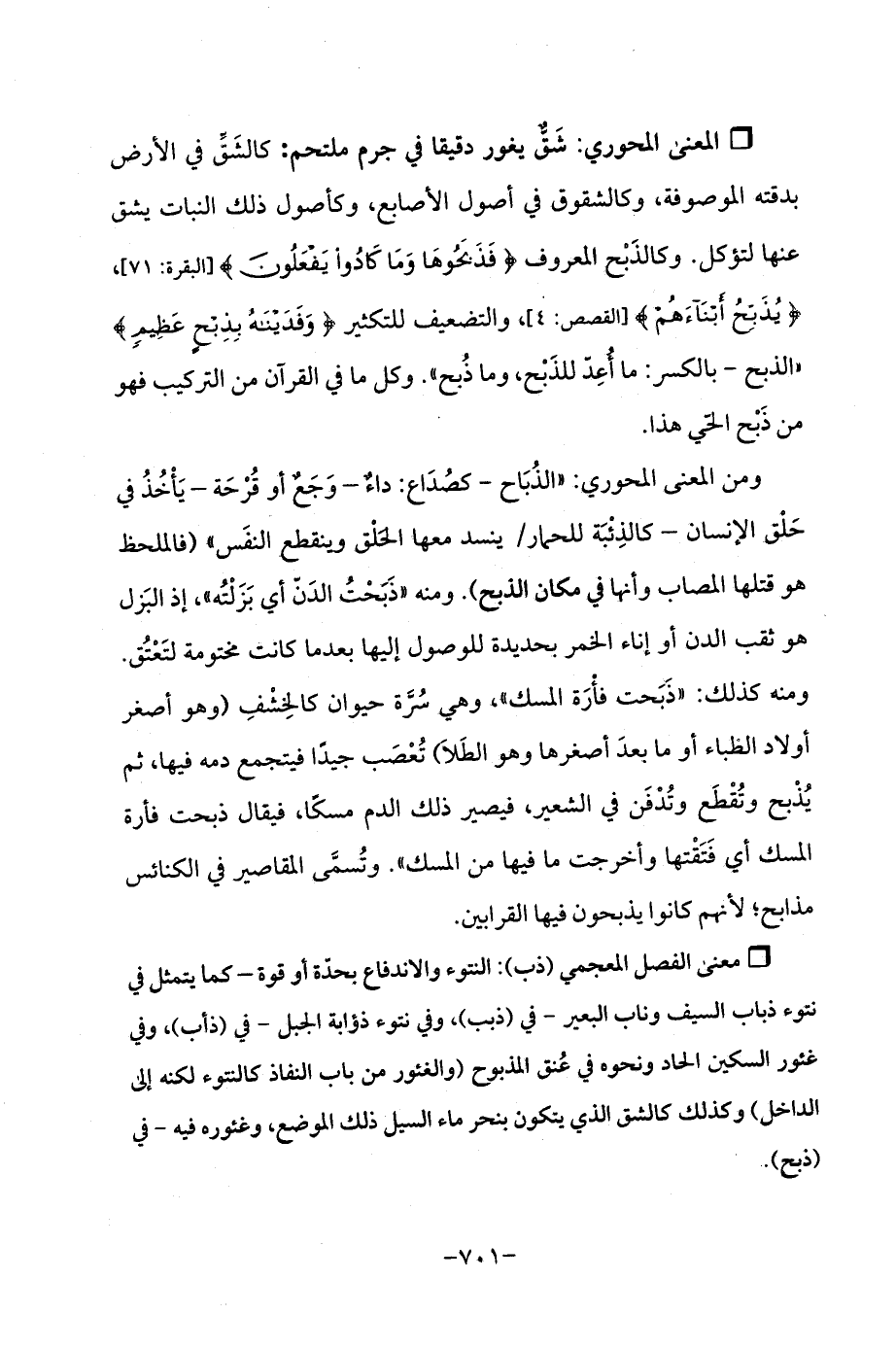Qشَقٌّ يغور دقيقا فى جرم ملتحم: كالشَقِّ في الأرض بدقته الموصوفة، وكالشقوق في أصول الأصابع، وأصول ذلك النبات يشق عنها لتؤكل. وكالذَبْح المعروف {فَذَبَحُوهَا وَمَا كَادُوا يَفْعَلُونَ} [البقرة 71]، {يُذَبِّحُ أَبْنَاءَهُمْ} [القصص: 4]، والتضعيف للتكثير {وَفَدَيْنَاهُ بِذِبْحٍ عَظِيمٍ} "الذبح -بالكسر: ما أُعِدّ للذَبْح، وما ذُبح ". وكل ما في القرآن من التركيب فهو من ذَبْح الحيّ هذا.