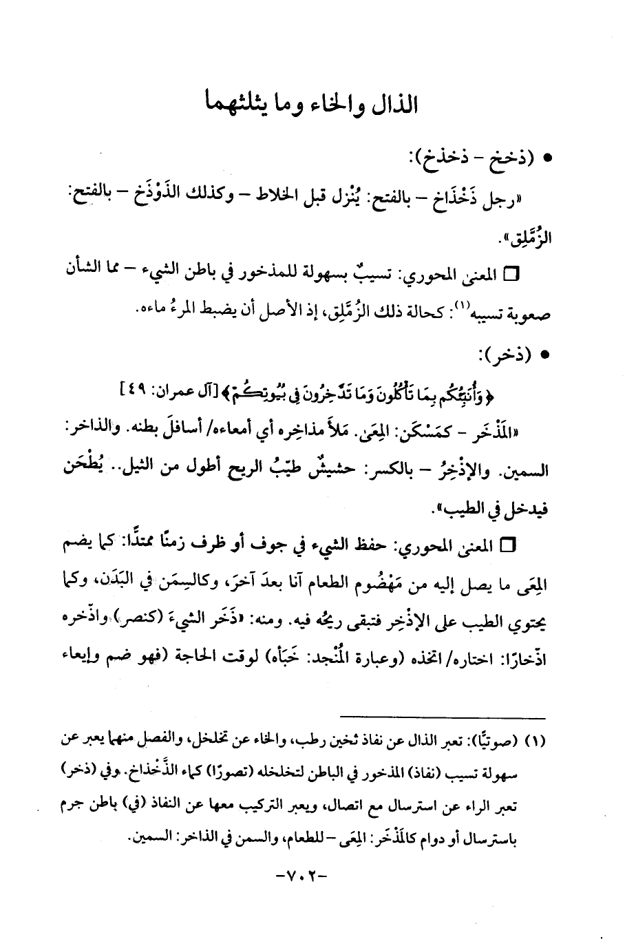 (¬1) (صوتيًّا): تعبر الذال عن نفاذ ثخين رطب، والخاء عن تخلخل، والفصل منهما يعبر عن سولة تسيب (نفاذ) المذخور في الباطن لتخلخله (تصورًا) كما. الذَّخْذاخ. وفي (ذخر) تعبر الراء عن استرسال مع اتصال، ويعبر التركيب معها عن النفاذ (في) باطن جرم باسترسال أو دوام كالمَذْخَر: المِعَى -للطعام، والسمن في الذاخز: السمين.