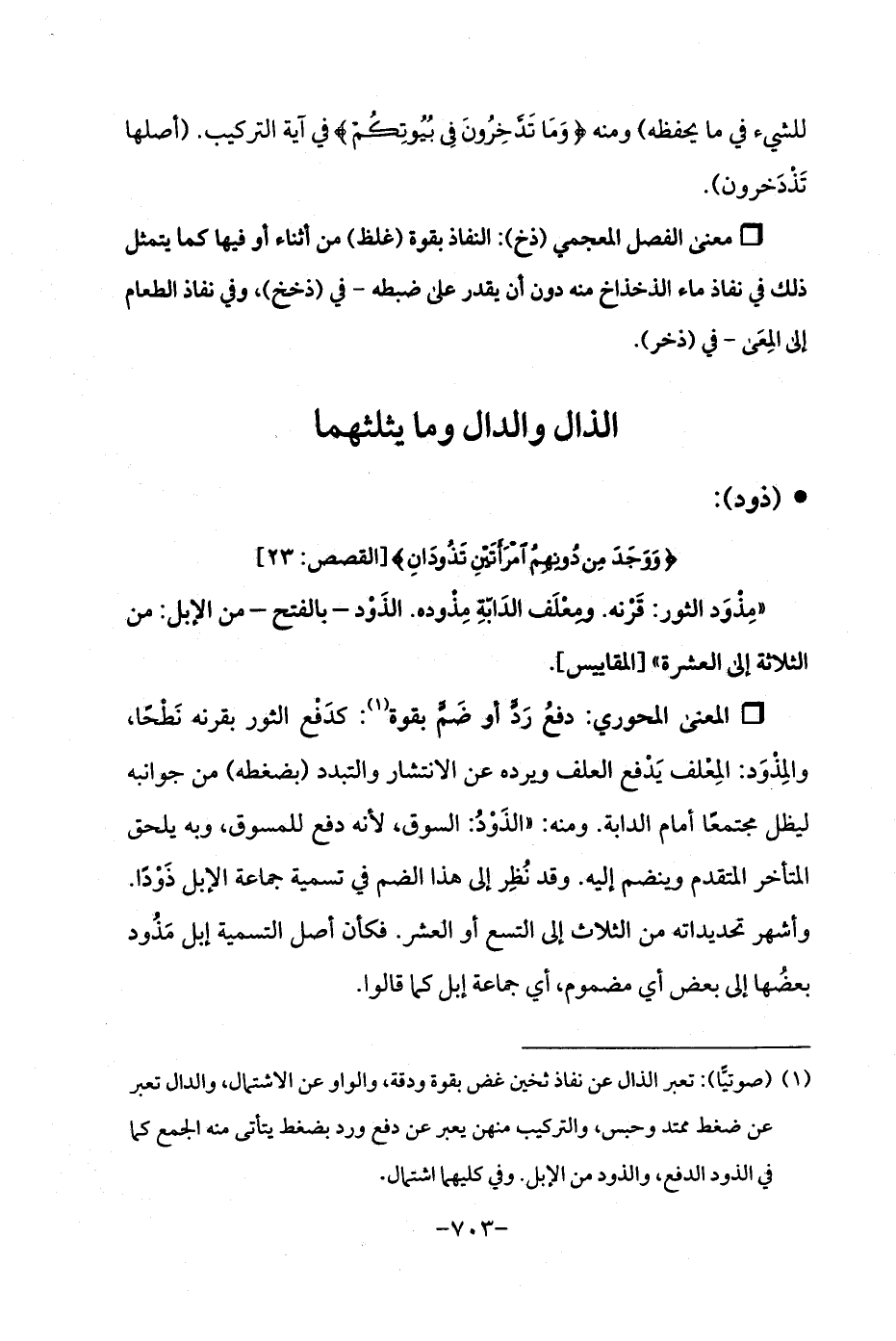 (¬1) (صوتيًّا): تعبر الذال عن نفاذ ثخين غض بقوة ودقة، والواو عن الاشتمال، والدال تعبر عن ضغط ممتد وحبس، والتركيب منهن يعبر عن دفع ورد بضغط يتأتى منه الجمع كما في الذود الدفع، والذود من الإبل. وفي كليهما اشتمال.
