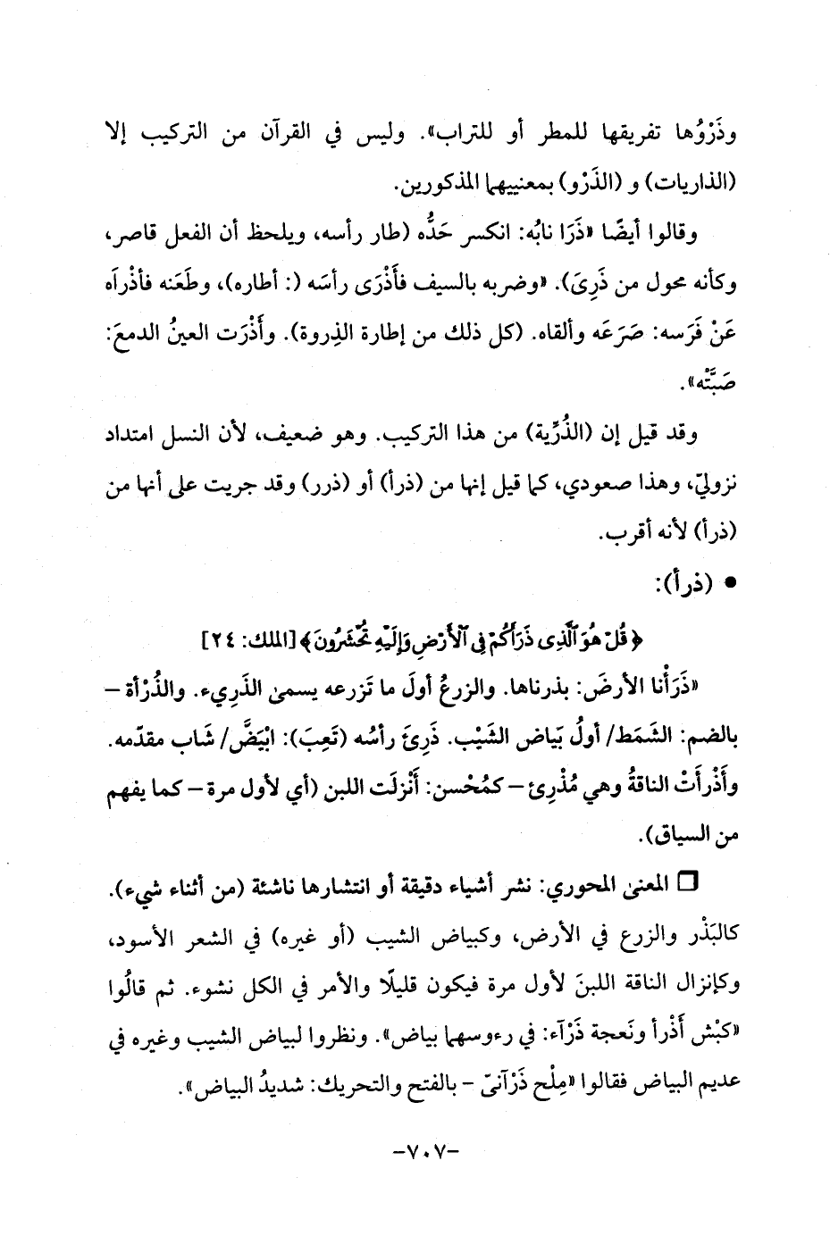 "ذَرَأْنا الأرضَ: بذرناها. والزرعُ أولَ ما تَزرعه يسمى الذَرِيء. والذُرْأة -بالضم: الشَمَط/ أولُ بَياض الشَيْب. ذَرِئَ رأسُه (تَعِبَ): ابْيَضَّ/ شَاب مقدّمه. وأَذْرأَتْ الناقةُ وهي مُذْرِئ -كمُحْسن: أَنْزلَت اللبن (أي لأول مرة -كما يفهم من السياق).