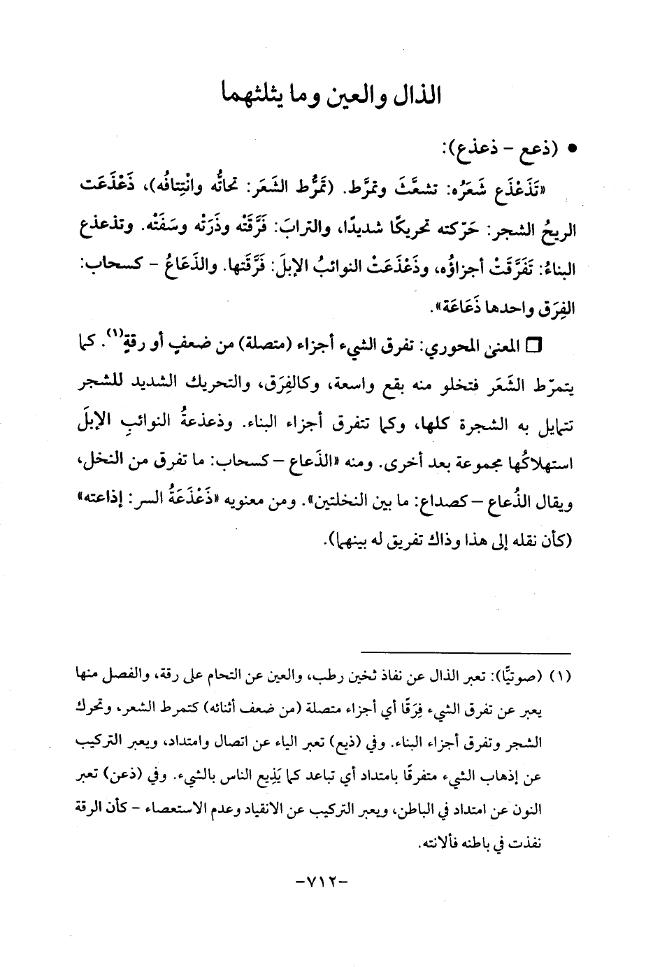 (¬1) (صوتيًّا): تعبر الذال عن نفاذ ثخين رطب، والعين عن التحام على رقة، والفصل منها يعبر عن تفرق الشيء فِرَقًا أي أجزاء متصلة (من ضعف أثنائه) كتمرط الشعر، وتحرك الشجر وتفرق أجزاء البناء. وفي (ذيع) تعبر الياء عن اتصال وامتداد، ويعبر التركيب عن إذهاب الشيء متفرقًا بامتداد أي تباعد كما يَذِيع الناس بالشيء. وفي (ذعن) تعبر النون عن امتداد في الباطن، ويعبر التركيب عن الانقياد وعدم الاستعصاء -كأن الرقة نفذت في باطنه فألانته.