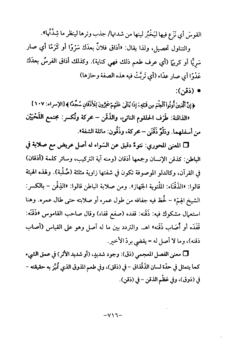 Qنتوءٌ دقيق عن السَواء له أصل عريض مع صلابة في الباطن: كذقن الإنسان وجمعها أذقان (ومنه آية التركيب، وسائر كلمة (أدقان) في القرآن، وكالدلو الموصوفة تكون في شفتها زاوية مثلثة (صُلْبة). ولهذه الهيئة قالوا: "الذَقْنَاء: الملْتوية الجهاز ". ومن صلابة الباطن قالوا: "الذِقْن -بالكسر: الشيخ الِهمّ "- لُحظ فيه جفافه من طول عمره أو صلابته حتى طال عمره. وهنا استعمال مشكوك فيه: ذَقَنه: قفده (صفع قفاه) وقال صاحب القاموس "ذَقَنَه: قَفَدَه أو أَصَاب ذَقَنه "اه. والتردد بين ما له أصل وهو على القياس (أصاب ذقنه)، وما لا أصل له= يقضي بردّ الأخير.