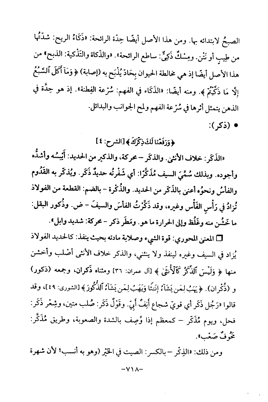 Qقوة الشيء وصلابة مادته بحيث ينفذ: كالحديد الفولاذ يُزاد في السيف وغيره لينفذ ولا ينثني، والذكر خلاف الأنثى أصْلب وأخشن منها {وَلَيْسَ الذَّكَرُ كَالْأُنْثَى} [آل عمران: 36] ومثناه ذَكران، وجمعه (ذكور) و (ذُكْران). {يَهَبُ لِمَنْ يَشَاءُ إِنَاثًا وَيَهَبُ لِمَنْ يَشَاءُ الذُّكُورَ} [الشورى: 49]، وقد قالوا "رَجُل ذَكَر أي قوقي شجاع أنِفٌ أَبِيّ. وقَوْلٌ ذَكَر: صُلب متين، وشِعْر ذَكَر: فحل، ويوم مُذَكّر -كمعظم إذا وُصِف بالشدة والصعوبة، وطريق مُذَكَّر: مَحُوفٌ صَعْب ".