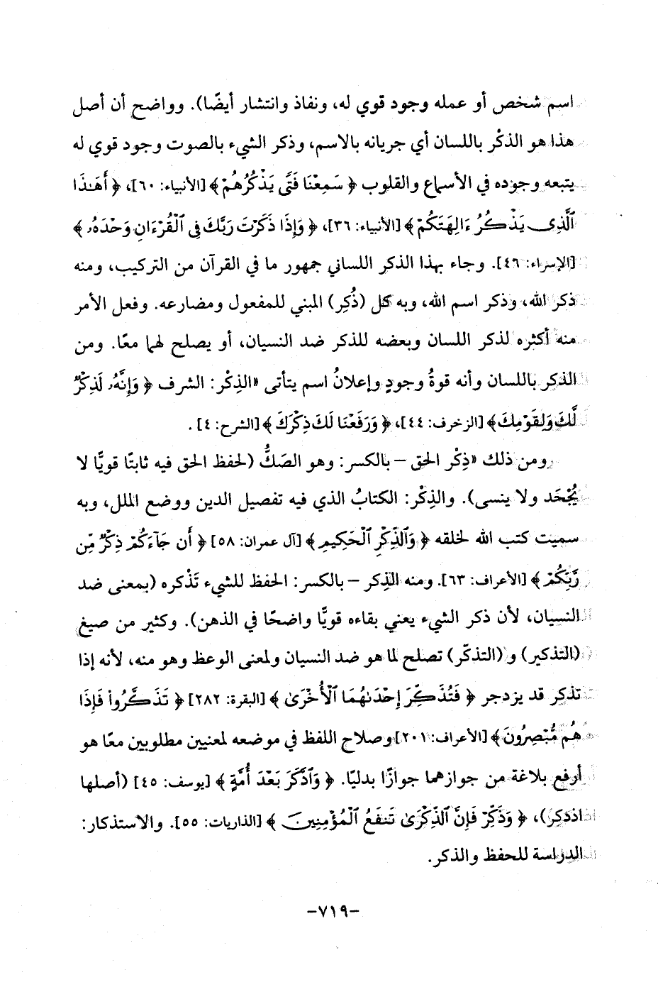 ومن ذلك "ذِكْر الحق -بالكسر: وهو الصَكُّ (لحفظ الحق فيه ثابتًا قويًّا لا يُجْحَد ولا ينسى). والذِكْر: الكتابُ الذي فيه تفصيل الدين ووضع الملل، وبه سميت كتب الله لخلقه {وَالذِّكْرِ الْحَكِيمِ} [آل عمران: 58] {أَنْ جَاءَكُمْ ذِكْرٌ مِنْ رَبِّكُمْ} [الأعراف: 63]. ومنه الذِكر -بالكسر: الحفظ للشيء تَذْكره (بمعنى ضد النسيان، لأن ذكر الشيء يعني بقاءه قويًّا واضحًا في الذهن). وكثير من صيغ (التذكير) و (التذكّر) تصلح لما هو ضد النسيان ولمعنى الوعظ وهو منه، لأنه إذا تذكر قد يزدجر {فَتُذَكِّرَ إِحْدَاهُمَا الْأُخْرَى} [البقرة: 282] {تَذَكَّرُوا فَإِذَا هُمْ مُبْصِرُونَ} [الأعراف: 201] وصلاح اللفظ في موضعه لمعنيين مطلوبين معًا هو أرفع بلاغة من جوازهما جوازًا، بدليًا. {وَادَّكَرَ بَعْدَ أُمَّةٍ} [يوسف: 45] (أصلها اذدكر)، {وَذَكِّرْ فَإِنَّ الذِّكْرَى تَنْفَعُ الْمُؤْمِنِينَ} [الذاريات: 55]. والاستذكار: الدراسة. للحفظ والذكر.
