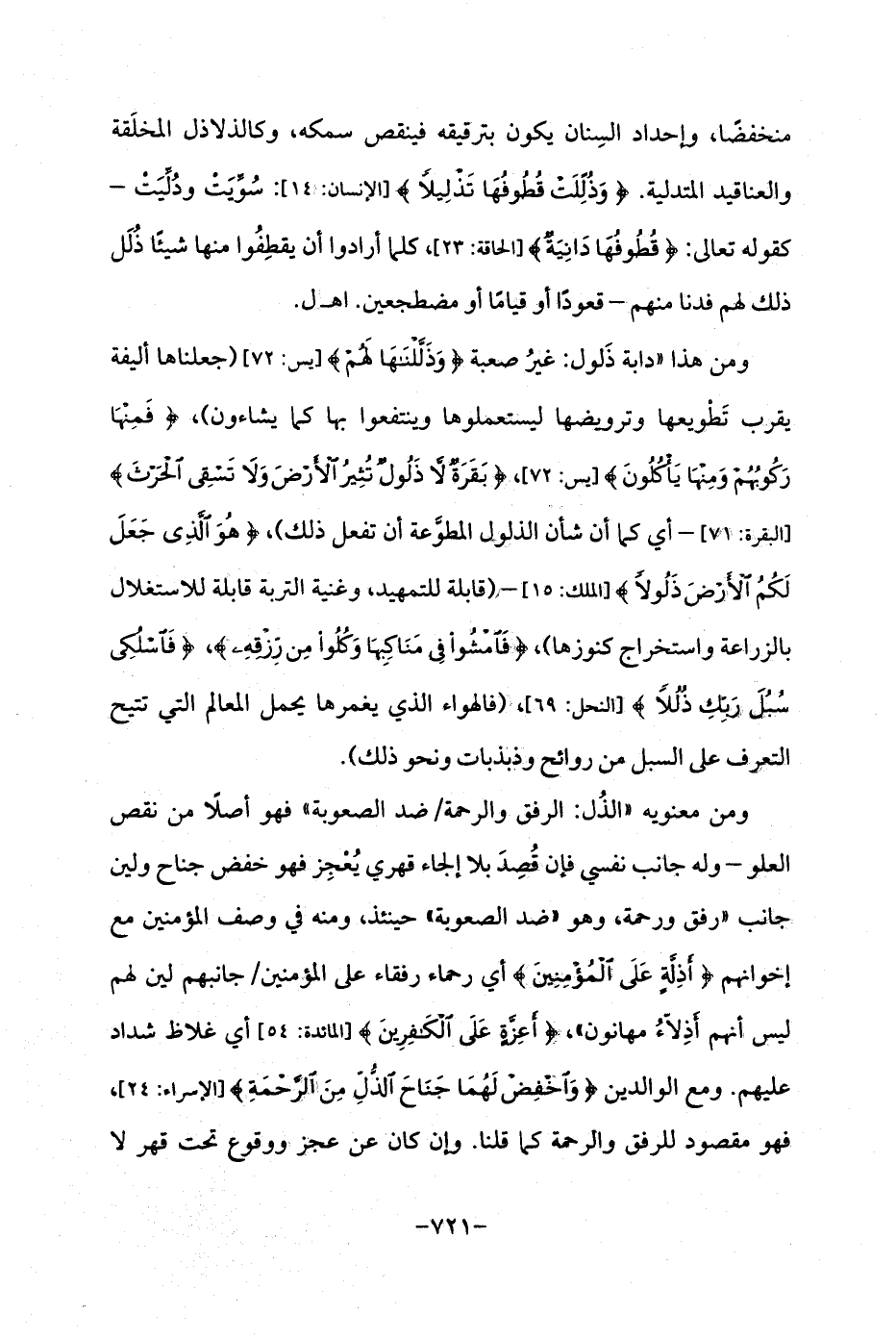 ومن هذا "دابة ذَلول: غيرُ صعبة {وَذَلَّلْنَاهَا لَهُمْ} [يس: 72] (جعلناها أليفة يقرب تَطويعها وترويضها ليستعملوها وينتفعوا بها كما يشاءون)، {فَمِنْهَا رَكُوبُهُمْ وَمِنْهَا يَأْكُلُونَ} [يس: 72]، {بَقَرَةٌ لَا ذَلُولٌ تُثِيرُ الْأَرْضَ وَلَا تَسْقِي الْحَرْثَ} [البقرة: 71]- أي كا أن شأن الذلول المطوَّعة أن تفعل ذلك)، {هُوَ الَّذِي جَعَلَ لَكُمُ الْأَرْضَ ذَلُولًا} [الملك: 15]- (قابلة للتمهيد، وغنية التربة قابلة للاستغلال بالزراعة واستخراج كنوزها)، {فَامْشُوا فِي مَنَاكِبِهَا وَكُلُوا مِنْ رِزْقِهِ}، {فَاسْلُكِي سُبُلَ رَبِّكِ ذُلُلًا} [النحل: 69]، (فالهواء الذي يغمرها يحمل المعالم التي تتيح التعرف على السبل من روائح وذبذبات ونحو ذلك).