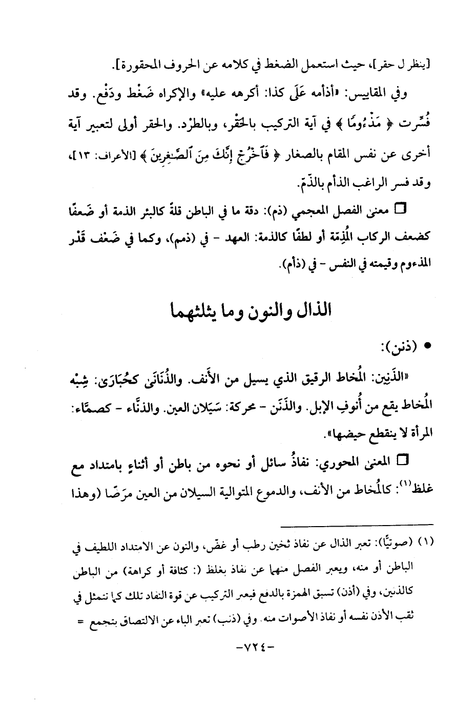 (¬1) (صوتيًّا): تعبر الذال عن نفاذ ثخين رطب او غضّ، والنون عن الامتداد اللطيف في الباطن أو منه، ويعبر الفصل منهما عن نفاذ بغلظ (: كثافة أو كراهة) من الباطن كالذنين، وفي (أذن) تسبق الهمزة بالدفع فيعبر التركيب عن قوة النفاد تلك كما تتمثل في ئقب الأذن نفسه أو نفاذ الأصوات منه وفي (ذنب) تعبر الباء عن الالتصاق بتجمع=