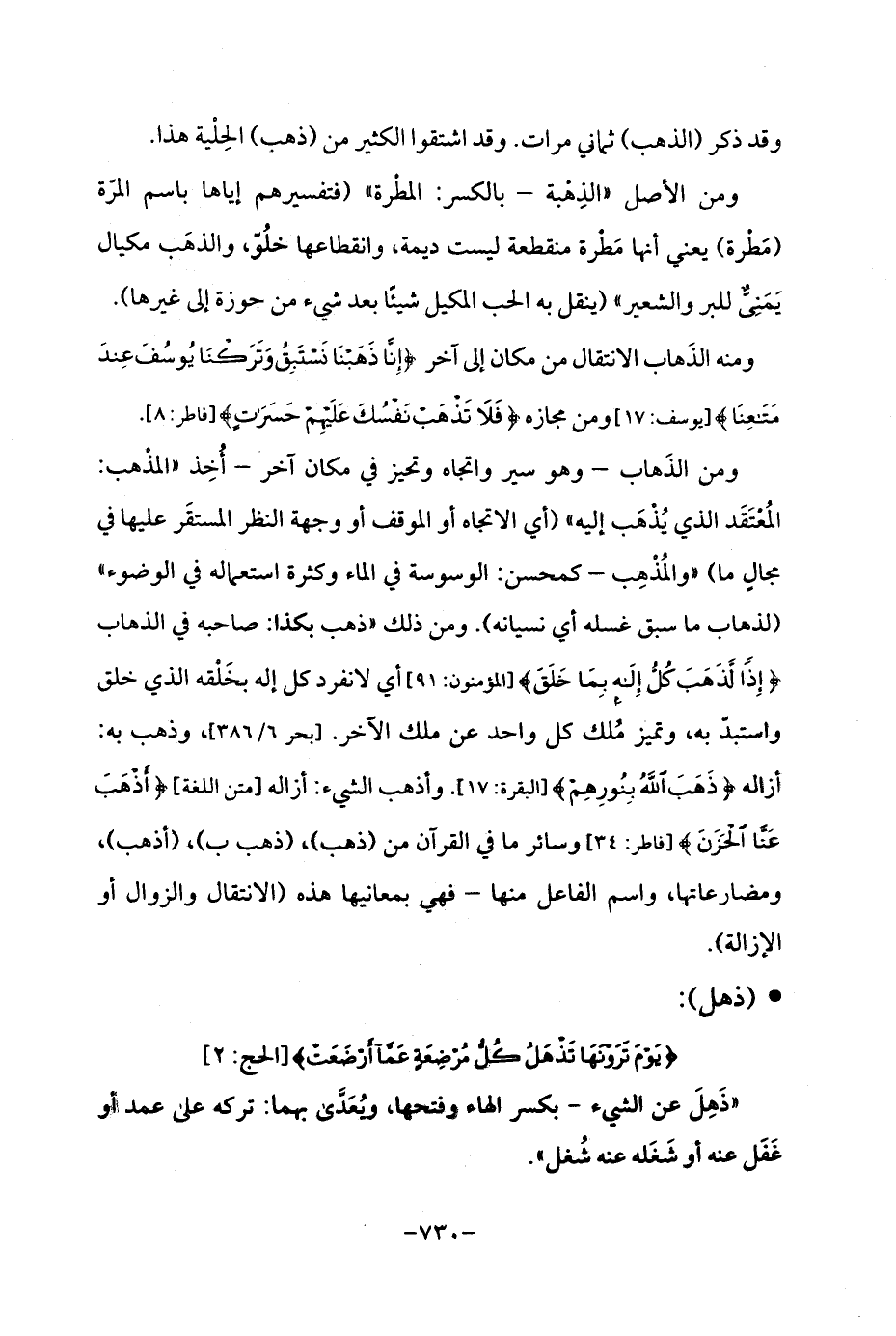 ومنه الذَهاب الانتقال من مكان إلى آخر {إِنَّا ذَهَبْنَا نَسْتَبِقُ وَتَرَكْنَا يُوسُفَ عِنْدَ مَتَاعِنَا} [يوسف: 17] ومن مجازه {فَلَا تَذْهَبْ نَفْسُكَ عَلَيْهِمْ حَسَرَاتٍ} [فاطر: 8].