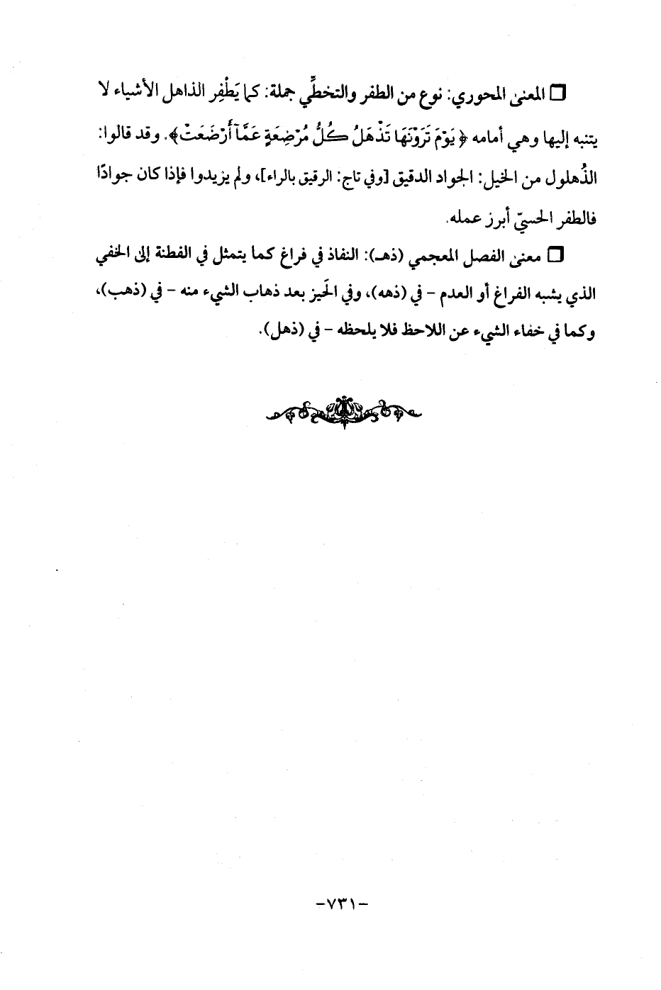 Qنوع من الطفر والتخطَّي جملة: كما يَطْفِر الذاهل الأشياء لا يتنبه إليها وهي أمامه {يَوْمَ تَرَوْنَهَا تَذْهَلُ كُلُّ مُرْضِعَةٍ عَمَّا أَرْضَعَتْ} وقد قالوا: الذُهلول من الخيل: الجواد الدقيق [وفي تاج: الرقيق بالراء]، ولم يزيدوا فإذا كان جوادًا فالطفر الحسيّ أبرز عمله.