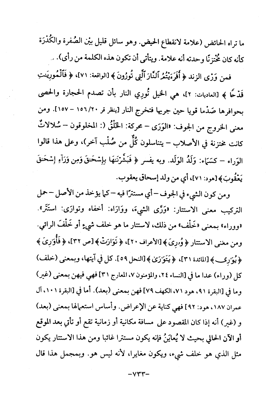 ومن كون الشيء في الجوف -أي مستترًا فيه-كما يؤخذ من الأصل- حمل التركيب معنى الاستتار: "وَرى الي "ووَارَاه: أخفاه وتوارَى: استَتَر "، "ووراء "بمعنى "خَلْف "من ذلك، لاستتار ما هو خلف شيءٍ أو خَلْفَ الرائي. ومن معْنى الاستتار {وُورِيَ} [الأعراف 20]، {تَوَارَتْ} [ص 32]، {فَأُوَارِيَ} {يُوَارِي} [المائدة 31]، {يَتَوَارَى} [النحل 59]. كل في آيتها، وبمعنى (خلف) كل (وراء) عدا ما في [النساء 24، والمؤمنون 7، المعارج 31] فهي فيهن بمعنى (غير) وما في [البقرة 91، هود 71، الكهف 79] فهن بمعنى (بعد). أما في [البقرة 101، آل عمران 187، هود: 92] فهي كناية عن الإعراض. وأساس استعمالها بمعنى (بعد) و (غير) أنه إذا كان المقصود على مسافة مكانية أو زمانية تقع أو تأتي بعد الموقع أو الآن الحالي بحيث لا يُعايَنُ فإنه يكون مستترا غائبا ومن هذا الاستتار يكون مثل الذي هو خلف شيء، ويكون مغايرا، لأنه ليس هو. وبمجمل هذا قال