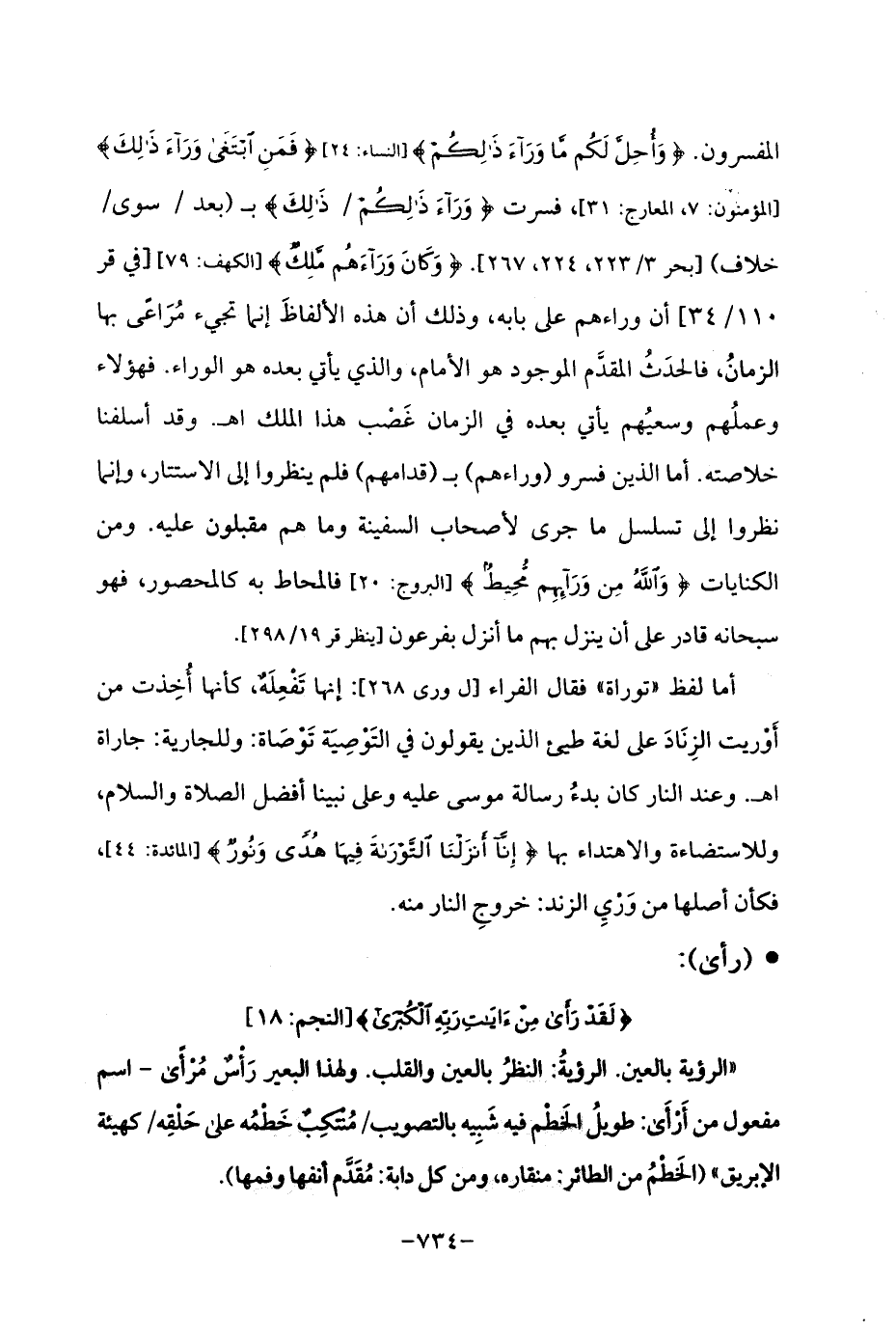 المفسرون. {وَأُحِلَّ لَكُمْ مَا وَرَاءَ ذَلِكُمْ} [النساء: 24] {فَمَنِ ابْتَغَى وَرَاءَ ذَلِكَ} [المؤمنون: 7، المعارج: 31]، فسرت {وَرَاءَ ذَلِكُمْ/ ذَلِكَ} بـ (بعد/ سوى/ خلاف) [بحر 3/ 223، 224، 267]. {وَكَانَ وَرَاءَهُمْ مَلِكٌ} [الكهف: 79] [في قر 110/ 34] أن وراءهم على بابه، وذلك أن هذه الألفاظَ إنما تجيء مُرَاعًى بها الزمانُ، فالحدَثُ المقدَّم الموجود هو الأمام، والذي يأتي بعده هو الوراء. فهؤلاء وعملُهم وسعيُهم يأتي بعده في الزمان غَصْب هذا الملك اه. وقد أسلفنا خلاصته. أما الذين فسرو (وراءهم) بـ (قدامهم) فلم ينظروا إلى الاستتار، وإنما نظروا إلى تسلسل ما جرى لأصحاب السفينة وما هم مقبلون عليه. ومن الكنايات {وَاللَّهُ مِنْ وَرَائِهِمْ مُحِيطٌ} [البروج: 20] فالمحاط به كالمحصور، فهو سبحانه قادر على أن ينزل بهم ما أنزل بفرعون [ينظر قر 19/ 298].