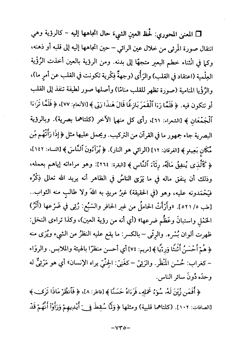 Qلُحظ العينِ الشيءَ حال اتجاهها إليه -كالرؤية وهي انتقال صورة المَرئى من خلال عين الرائي- حين اتجاهها إليه إلى قلبه أو ذهنه، وكما في انْثناء خطم البعير متجهًا إلى بدنه. ومن الرؤية بالعين أخذت الرُّؤْية العِلْمية (اعتقاد في القلب) والرَأْى (وجهةٌ فِكرية تكونت في القلب عن أمرٍ ما)، والرُؤْيا المنامية (صورة تظهر للقلب منامًا) وأصلها صور لطيفة تنفذ إلى القلب أو تتكون فيه. {فَلَمَّا رَأَى الْقَمَرَ بَازِغًا قَالَ هَذَا رَبِّي} [الأنعام: 77]، {فَلَمَّا تَرَاءَى الْجَمْعَانِ} [الشعراء: 61]، رأى كل منهما الآخر (كلتاهما بصرية). وبالرؤية البصرية جاء جمهور ما في القرآن من التركيب. ويحمل عليها مثل {إِذَا رَأَتْهُمْ مِنْ مَكَانٍ بَعِيدٍ} [الفرقان: 12] (الرائي هو النار). {يُرَاءُونَ النَّاسَ} [النساء: 142]، {كَالَّذِي يُنْفِقُ مَالَهُ رِئَاءَ النَّاسِ} [البقرة: 264]: وهو مراءاته إياهم بعمله، وذلك أن ينفق ماله في ما يَرَى الناسُ في الظاهر أنه يريد الله تعالى ذِكْرُه فيَحْمَدونه عليه، وهو (في الحقيقة) غيرُ مريدٍ به اللهَ ولا طالبٍ منه الثواب .. [طب/ 5/ 521]. "وأَرْأَت الحاملُ من غير الحافر والسَبُع: رُئِى في ضَرْعها (أَثَرُ) الحَمْلِ واستبانَ وعَظُم ضرعها " (أي أنه من رؤية العين)، وكذا تراءى النخل: ظهرت ألوان بُسره. والرِئى -بالكسر: ما يقع عليه النظرُ من الشيء ويُرَى منه {هُمْ أَحْسَنُ أَثَاثًا وَرِئْيًا} [مريم: 74] أي أحسن منظرًا بالهيئة والملابس. والروَاء -كغراب: حُسْن المَنْظَر. والرَئىّ -كغَنِىّ: الجِنِّيّ يراه الإنسان "أي هو مَرْئِىٌّ له وحدَه دُونَ سائر الناس.