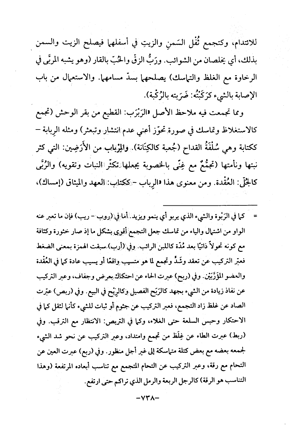 = كما في الرَبْوة والشيء الذي يربو أي ينمو ويزيد. أما في (روب - ريب) فإن ما تعبر عنه الواو من اشتمال والياء من تماسك جعل التجمع أقوي بشكل ما إذ صار خثورة وكثافة مع كونه تحولًا ذاتيًا بعد مُدّة كاللبن الراثب. وفي (أرب) سبقت الهمزة بمعنى الضغط فعبّر التركيب عن تعقد وشَدٍّ وتجمع لما هو متسيب واقعًا أو يسيب عادة كما في العُقدة والعضو المؤَرَّبَيْن. وفي (ربح) عبرت الحاء عن احتكاك بعرض وجفاف، وعبر التركيب عن نفاذ زيادة من الشيء بجهد كالرَبَح الفصيل وكالرِبْح في البيع. وفي (ربص) عبّرت الصاد عن غلظ زاد التجمع، فعبر التركيب عن جثوم أو ثبات للشيء كأنما لثقلَ كما في الاحتكار وحبس السلعة حتى الغلاء، وكما في التربص: الانتظار مع الترقب، وفي (ربط) عبرت الطاء عن غِلَظ من تجمع وامتداد، وعبر التركيب عن نحو شد الشيء لجمعه بعضه مع بعض كتلة متماسكة إلى غير أجل منظور. وفي (ربع) عبرت العين عن التحام مع رقة، وعبر التركيب عن التحام المتجمع مع تناسب أبعاده المرتفعة (وهذا التناسب هو الرقة) كالرجل الربعة والرمل الذي تراكم حتى ارتفع.