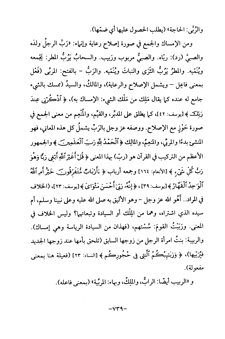 ومن الإمساك والجمع في صورة إصلاح رعاية وإنماء: "رَبَّ الرجلُ ولدَه والصبيَّ (رد): ربّاه. والصبيُّ مربوب ورَبيب. والسحابُ يَرُبُّ المطر: يَجْمعه وُينَمّيه. والمطرُ يَرُبُّ الثَرَى والنباتَ ويُنَمّيه. والرَبُّ -بالفتح: المربِّى (فَعْل بمعنى فاعِل- ويشمل الإصلاح والرعاية)، والمالكُ، والسيدُ (ممسك بالشيء جامع له عنده كما يقال مَلِك من مَلْك الشيء: الإمساك به)، {اذْكُرْنِي عِنْدَ رَبِّكَ} [يوسف: 42]، كما يطلق على المدبِّر، والقيِّم، والمُنْعِم من معنى الجمع في صورة حَوْزٍ مع الإصلاح. ووصفه عز وجل بالرَبِّ يشملُ كل هذه المعاني، فهو المنشئ بدءًا والمربِّي، والمنعِمُ، والمالِك {الْحَمْدُ لِلَّهِ رَبِّ الْعَالمِينَ} والجمهور الأعظم من التركيب في القرآن هو (ربّ) بهذا المعنى {قُلْ أَغَيْرَ اللَّهِ أَبْغِي رَبًّا وَهُوَ رَبُّ كُلِّ شَيْءٍ} [الأنعام: 164] وجمعه أرباب {أَأَرْبَابٌ مُتَفَرِّقُونَ خَيْرٌ أَمِ اللَّهُ الْوَاحِدُ الْقَهَّارُ} [يوسف: 39]، {إِنَّهُ رَبِّي أَحْسَنَ مَثْوَايَ} [يوسف: 23]، (الخلاف في المراد .. أَهُو الله عز وجل -وهو الأليق به صلى الله عليه وعلى نبينا وسلم، أم سيده الذي اشتراه، وهما من المِلْك أو السيادة وتبعاتهما؟ وليس الخلاف في المعنى. ورَبَبْتُ القومَ: سُسْتهم، (فهذان من السيادة الرياسة وهي إمساك). والربيبة: بنتُ امرأة الرجل من زوجها السابق (تلحق بأمها عند زوجها الجديد فيُرَبّيها)، {وَرَبَائِبُكُمُ اللَّاتِي فِي حُجُورِكُمْ} [النساء: 23] (فعيلة هنا بمعنى مفعولة).
