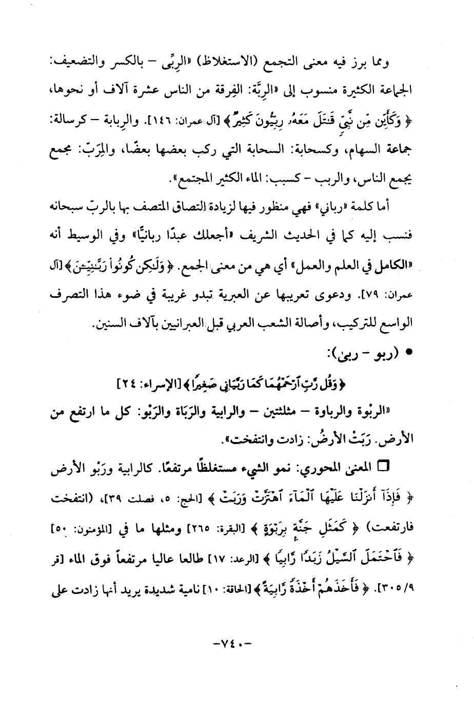 أما كلمة "رباني "فهي منظور فيها لزيادة التصاق المتصف بها بالربّ سبحانه فنسب إليه كما في الحديث الشريف "أجعلك عبدًا ربانيًّا "وفي الوسيط أنه "الكامل في العلم والعمل "أي هي من معنى الجمع. {وَلَكِنْ كُونُوا رَبَّانِيِّينَ} [آل عمران: 79]. ودعوى تعريبها عن العبرية تبدو غريبة في ضوء هذا التصرف الواسع للتركيب، وأصالة الشعب العربي قبل العبرانيين بآلاف السنين.