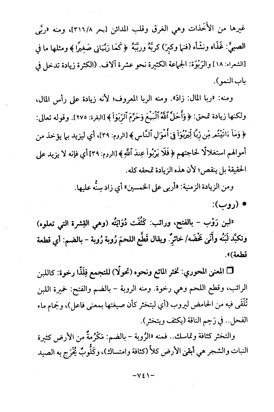 ومنه: "ربا المال: زادَ ". ومنه الربا المعروف؛ لأنه زيادة على رأس المال، ولكنها زيادة تمحق: {وَأَحَلَّ اللَّهُ الْبَيْعَ وَحَرَّمَ الرِّبَا} [البقرة: 275]. وقوله تعالى: {وَمَا آتَيْتُمْ مِنْ رِبًا لِيَرْبُوَ فِي أَمْوَالِ النَّاسِ} [الروم: 39]، أي ليزيد بما يؤخذ من أموالهم استغلالًا لحاجتهم {فَلَا يَرْبُو عِنْدَ اللَّهِ} [الروم: 39] أي فإنه لا يزيد على الحقيقة بل ينقص؛ لأن هذه الزيادة تمحقه كله.