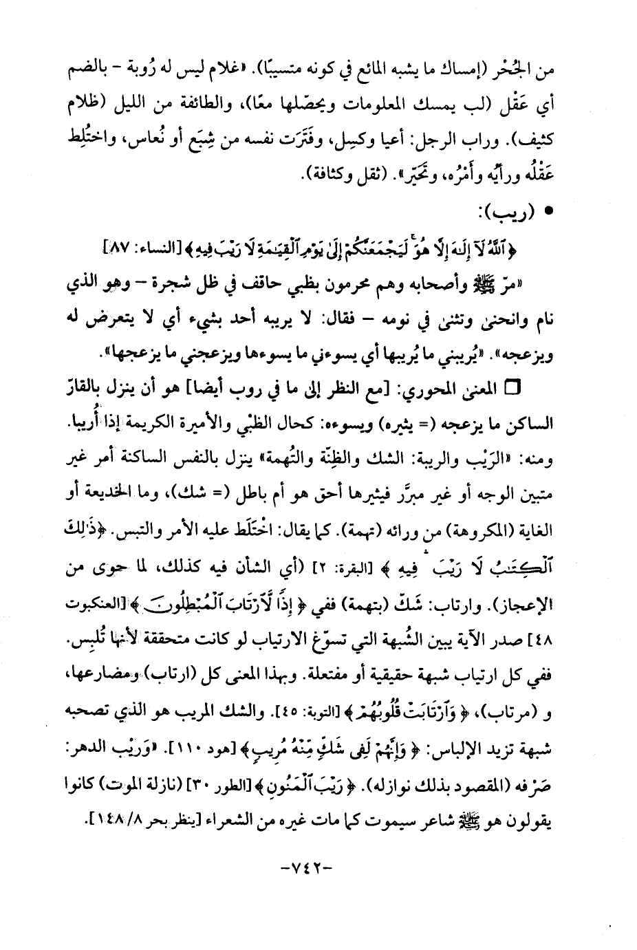 Q[مع النظر إلى ما في روب أيضًا] هو أن ينزل بالقارّ الساكن ما يزعجه (= يثيره) ويسوءه: كحال الظبْي والأميرة الكريمة إذا أُريبا. ومنه: "الرَيْب والريبة: الشك والظِنّة والتُهمة "ينزل بالنفس الساكنة أمر غير متبين الوجه أو غير مبرَّر فيثيرها أحق هو أم باطل (= شك)، وما الخديعة أو الغاية (المكروهة) من ورائه (تهمة). كما يقال: اخْتَلَط عليه الأمر والتبس. {ذَلِكَ الْكِتَابُ لَا رَيْبَ فِيهِ} [البقرة: 2] (أي الشأن فيه كذلك، لما حوى من الإعجاز). وارتاب: شَكّ (بتهمة) ففي {إِذًا لَارْتَابَ الْمُبْطِلُونَ} [العنكبوت 48] صدر الآية يبين الشُبهة التي تسوّغ الارتياب لو كانت متحققة لأنها تُلبِس. ففي كل ارتياب شبهة حقيقية أو مفتعلة. وبهذا المعنى كل (ارتاب) ومضارعها، و (مرتاب)، {وَارْتَابَتْ قُلُوبُهُمْ} [التوبة: 45]. والشك المريب هو الذي تصحبه شبهة تزيد الإلباس: {وَإِنَّهُمْ لَفِي شَكٍّ مِنْهُ مُرِيبٍ} [هود 110] "وَريْب الدهر: صَرْفه (المقصود بذلك نوازله). {رَيْبَ الْمَنُونِ} [الطور 30] (نازلة الموت) كانوا يقولون هو - صلى الله عليه وسلم - شاعر سيموت كما مات غيره من الشعراء [ينظر بحر 8/ 148].
