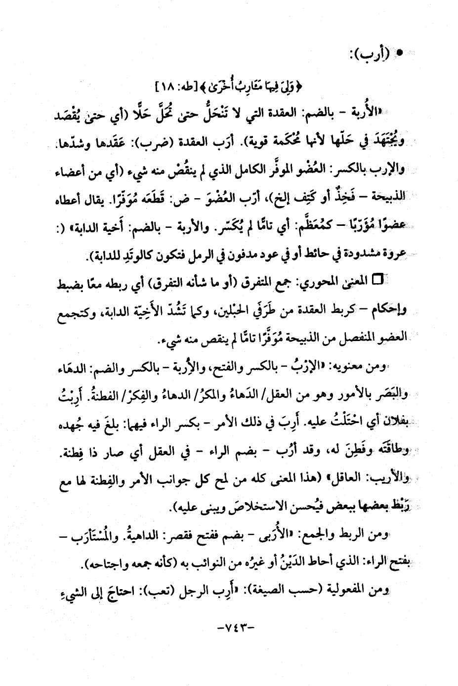 "الأُربة -بالضم: العقدة التي لا تَنْحَلُّ حتى تُحَلَّ حَلًّا (أي حتى يُقْصَد ويُجْتَهَدَ في حَلّها لانها مُحْكَمة قوية). أرَب العقدة (ضرب): عَقَدها وشدّها. والإرب بالكسر: العُضْو الموفَّر الكامل الذي لم ينقُصْ منه شيء (أي من أعضاء الذيحة -فَخِذٌ او كَتِف إلخ)، أرّب العُضْوَ -ض: قَطَعَه مُوَفّرًا. يقال أعطاه عضوًا مُؤرّبًا -كمُعَظَّم: أي تامًّا لم يُكَسّر. والأربة -بالضم: أَخية الدابة " (: عروة مشدودة في حائط أو في عود مدفون في الرمل فتكون كالوتَدِ للدابة).