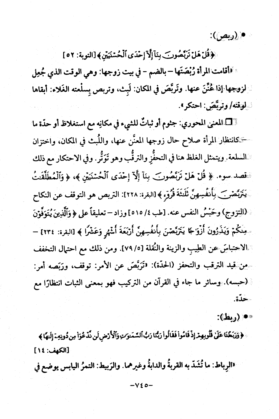 Qجثوم أو ثباتٌ للشيء في مكانِه مع استغلاظ أو حدّة ما -كانتظار المرأة صلاح حال زوجها المعنَّن عنها، واللُبث في المكان، واختزان السلعة. ويتمثل الغلظ هنا في التحفُّزِ والترقُّب وهو تَوَتُّر. وفي الاحتكار مع ذلك قصد سوء. {قُلْ هَلْ تَرَبَّصُونَ بِنَا إِلَّا إِحْدَى الْحُسْنَيَيْنِ}، {وَالْمُطَلَّقَاتُ يَتَرَبَّصْنَ بِأَنْفُسِهِنَّ ثَلَاثَةَ قُرُوءٍ} [البقرة: 228]: التربص هو التوقف عن النكاح (التزوج) وحَبْسُ. النفس عنه. وزاد -تعليقًا على {وَالَّذِينَ يُتَوَفَّوْنَ مِنْكُمْ وَيَذَرُونَ أَزْوَاجًا يَتَرَبَّصْنَ بِأَنْفُسِهِنَّ أَرْبَعَةَ أَشْهُرٍ وَعَشْرًا} [البقرة: 234]- الاحتباسَ عن الطِيبِ. والزينة والنُقلة. ومن ذلك مع احتمال التخفف من قيد الترقب والتحفز (الحدّة): "تَرَبَّصَ عن الأمر: توقف، ورَبَصه أمر: (حبسه). وسائر ما جاء في القرآن من التركيب فهو بمعنى الثبات انتظارًا مع حدّة.